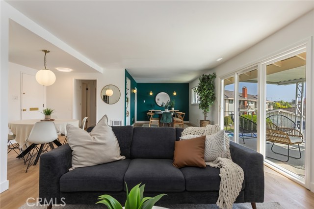 Welcome to 23028 Nadine Circle #B - a beautifully updated top-floor residence in the highly sought-after New Horizons 55+ community of South Torrance. This bright and spacious unit is flooded with natural light and offers peaceful greenbelt views from the large front patio, perfect for morning coffee or evening relaxation. Inside, you’ll find new flooring and lighting throughout, creating a fresh and modern feel. The open-concept living and dining areas flow seamlessly to both front and rear patios, bringing the outdoors in. A versatile den can easily be enclosed to serve as a third bedroom or private office. The primary suite includes ample closet space and an en-suite bath for comfort and convenience, while in-unit laundry adds everyday ease. Enjoy resort-style living with a 9-hole golf course, multiple swimming pools, a well-equipped clubhouse, fitness facilities, and a full calendar of community activities. Centrally located near shopping, dining, medical centers, and just minutes from the beach, this is the ideal blend of tranquility, lifestyle, and location. 23028 Nadine Circle #B - a bright, move-in-ready retreat in one of Torrance’s most desirable active adult communities.