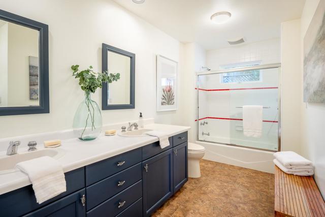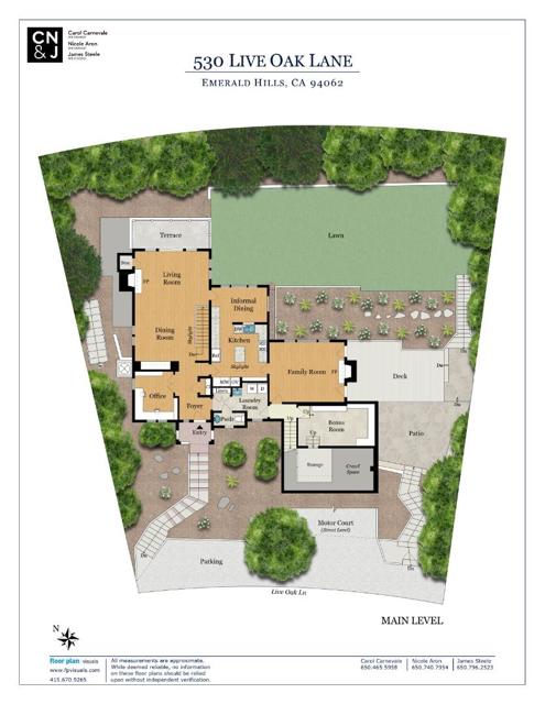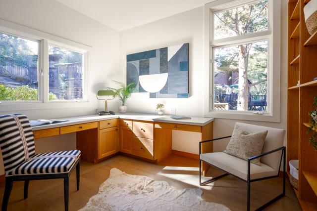 Spectacular San Francisco Bay views, architectural design, and exceptional level outdoor space distinguish this impressive Emerald Hills home. The extra-large lot, comprising two parcels, offers a sweeping entertaining deck and a patio plus vast synthetic lawn for play, a rare feature in this community. Rebuilt in 1992 and freshly updated, the home showcases dramatic volume with cathedral ceilings, walls of glass framing the views, and hardwood or wood-like floors in most rooms. Formal living and dining room with fireplace and built-in cabinetry opens to a Bay view deck. The kitchen has freshly painted cabinetry, a skylight, and a convenient pass-through to the casual dining room allowing Bay views from both areas. The inviting family room, also with Bay views, opens to an expansive deck and patio, plus there is a customized office and flexible-use finished bonus room. Three bedrooms on the lower level include a primary suite. There is also a large laundry room, street-level 2-car garage with EV outlet and direct access to the home, plus air conditioning. This home is near members-only Emerald Lake Country Club, acclaimed Roy Cloud Elementary, and Highway 280 for access to Silicon Valley or San Francisco.