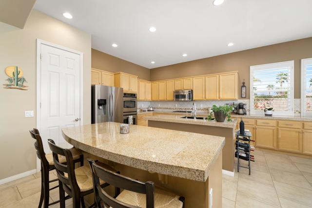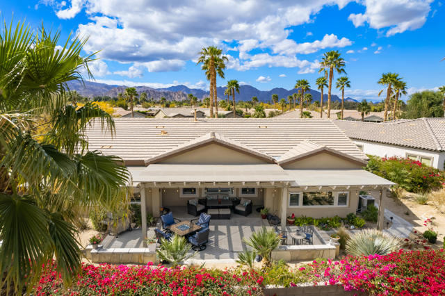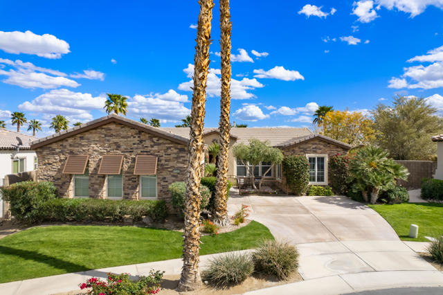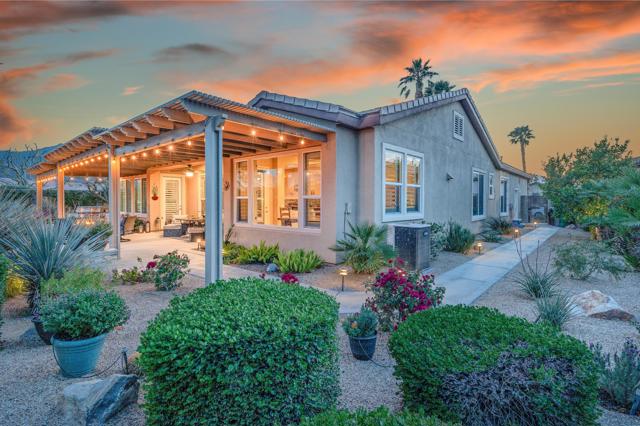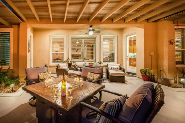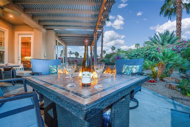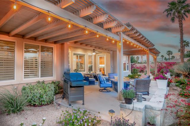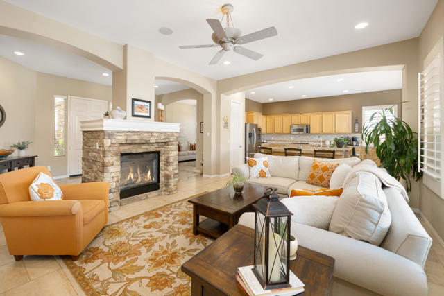 Live Life Brilliantly! Luxurious touches amplify the joy of desert living in this meticulous Trilogy at La Quinta resort property. A popular Oreas model, the home is open and bright with ten-foot ceilings and a smart and flexible 2,331 SQ FT floor plan that accommodates your changing lifestyle needs. The home is currently used as a three-bedroom, 3-baths with a great room with fireplace, a grand gourmet kitchen, and a separate large recreation room with direct access to a full bath. Resting on a grand 10,454 SQ FT lot with partial mountain views, there's plenty of space for a pool, spa, putting green and more. Set back off the end of a cul-de-sac, a gated front patio with big SW mountain views and tall wooden door mark the entry to the main home. A main entry, tile floors, and a striking double-sided stone fireplace hints at the quality and invigorating lifestyle that lay beyond. The great room is spacious with big picture windows and white plantation shutters. Stunning custom lit built-ins make way for a big screen TV and in-ceiling surround that elevates your in-home media experience. Cool winter nights and Holidays are warmed by the fire as new memories are made with family and friends. A true gourmet sized kitchen, it features a new premium stainless GE Profile cooktop, microwave, and dishwasher. Volumes of warm wood cabinets extend into the informal dining area and the pantry will keep all your kitchen ware neatly tucked away. A prep island and a separate entertainment island with seating are crowned in creamy textured granite. An outstanding bedroom retreat features a sumptuous walk-in shower with multiple rainshower and hand-held shower heads. Dual vanity custom wood cabinets, cool white quartz countertops and luminous LED lit mirrors, spacious closets, and a hidden bonus room with mounted TV, rounds out this perfect retreat. Step out each sun drenched morning onto the covered patio with a cup of Joe to plan a day of fun. As the evening wanes, relax on the courtyard and watch the sun as it slips behind the Santa Rosa Mountains. The garage has a new epoxy floor, tall storage cabinets, and space for all your toys. This home is meant to be treasured and enjoyed!