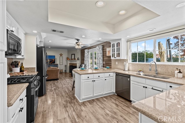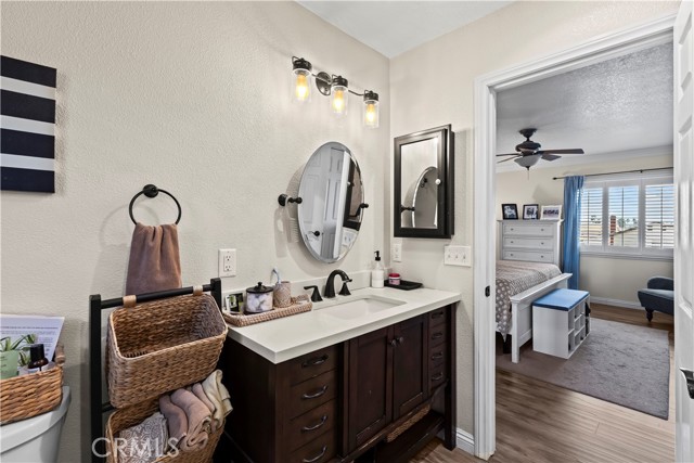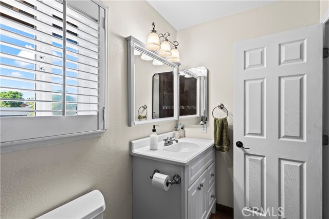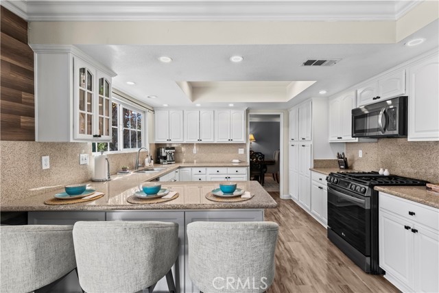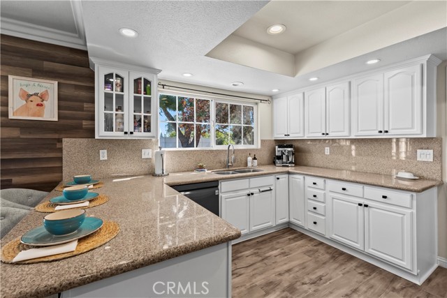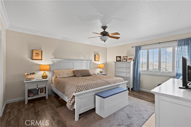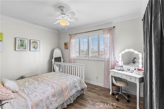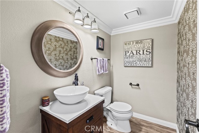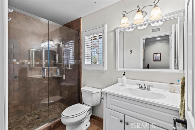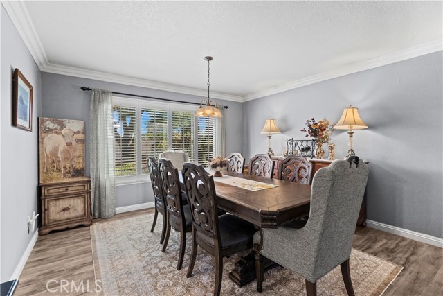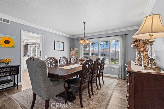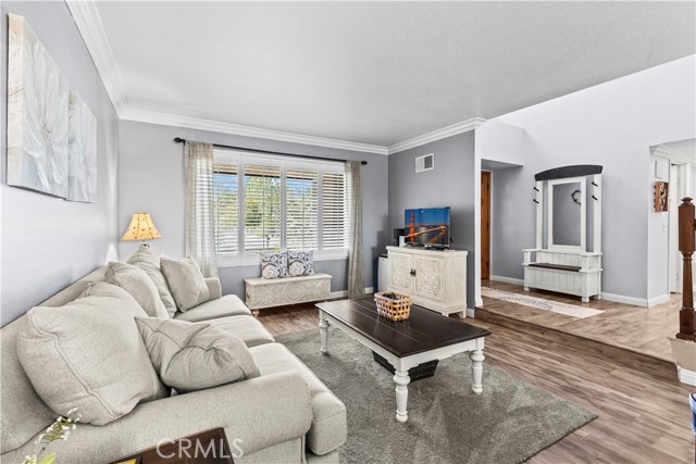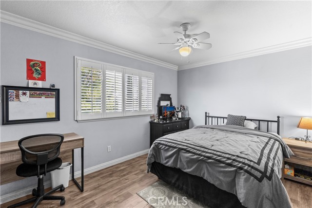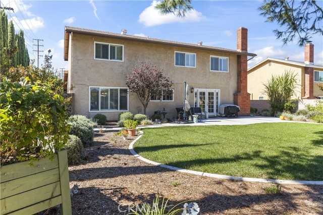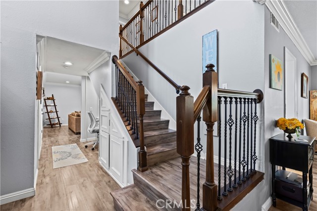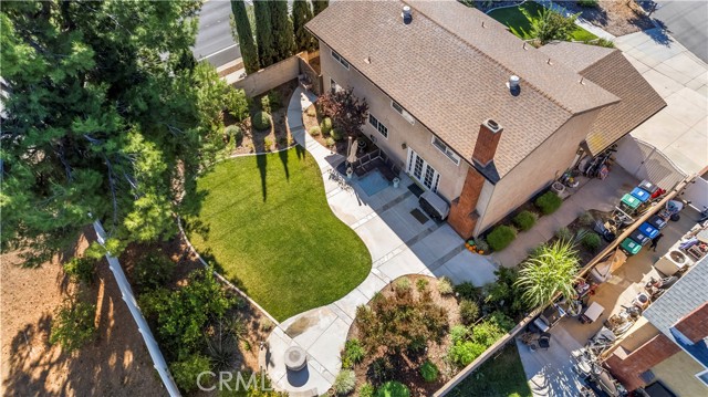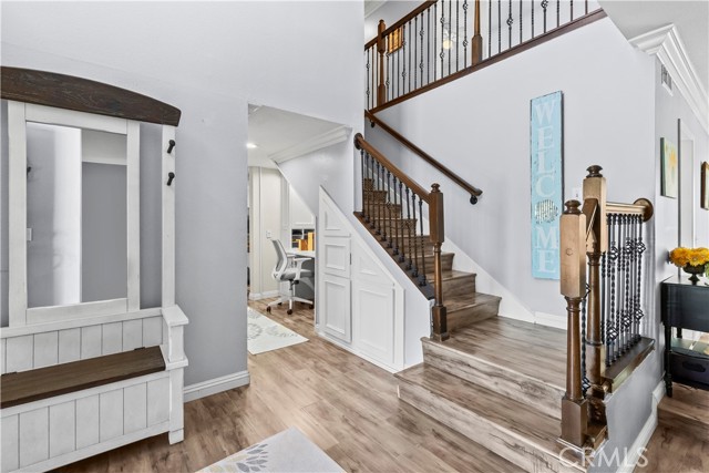 Nestled in the vibrant heart of Chino Hills, this stunning home is sure to captivate anyone who steps inside. As you enter through the exquisite glass-inlaid double oak doors, you'll be greeted by custom wainscoted cabinets, an elegant wrought iron staircase, durable laminate flooring, and neutrally painted walls that set the tone for the rest of the home. To the right of the entry, you'll find a spacious step-down formal living room, along with an adjacent formal dining room. Both spaces boast large windows that flood the rooms with natural light. On the left side of the entryway, there's a charming office area ingeniously designed beneath the staircase, complete with a built-in desk, cabinets, and lighting. The updated downstairs half bath features a stylish vanity and a bowl sink. Moving down the hall, you enter the family room, which is adorned with a fireplace featuring an impressive mantel. This room is complemented by glass French doors framed by a stunning shiplap wall. The kitchen, conveniently located next to the family room and dining area, is beautifully upgraded with granite countertops, newer appliances, fixtures, and hardware. On the upper level, you'll discover four bedrooms. The primary bedroom includes a ceiling fan, walk-in closet, and a nicely updated ensuite bathroom. The three secondary bedrooms are generously sized and each is equipped with a ceiling fan. The updated hallway bathroom features a lovely walk-in shower. Throughout the home, crown molding and plantation shutters add to the overall appeal. Both the front and backyards are professionally landscaped, showcasing lush green lawns, mature trees, a garden, and a fire pit. There is ample space for a pool or an ADU on this expansive 9,000 sq ft lot, along with the added bonus of RV parking. Additionally, this property is conveniently located near a variety of shops, dining options, and award-winning schools.