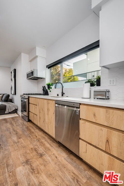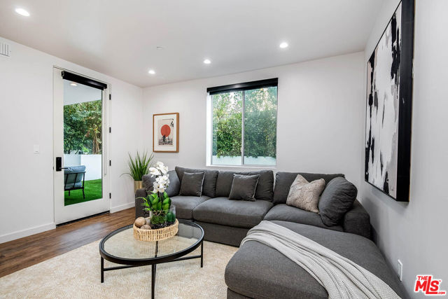 Spacious and fully furnished 1BD/1BA Apartment with rare private backyard in prime Beverly Grove. This well-appointed unit features an open layout with high ceilings, hardwood floors, and direct access to a large private patio from the living room. Modern kitchen with quartz countertops, stainless steel appliances, and custom cabinetry. The oversized bedroom includes a walk-in closet, and the large bathroom offers a soaking tub and glass-enclosed shower. Includes in-unit laundry, central A/C, controlled access, and two gated parking spaces. Located on a quiet, tree-lined street near The Grove, Erewhon, Melrose Place, and top dining and shopping.