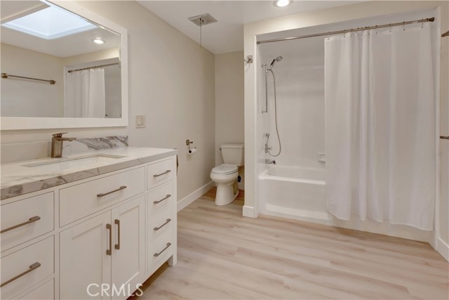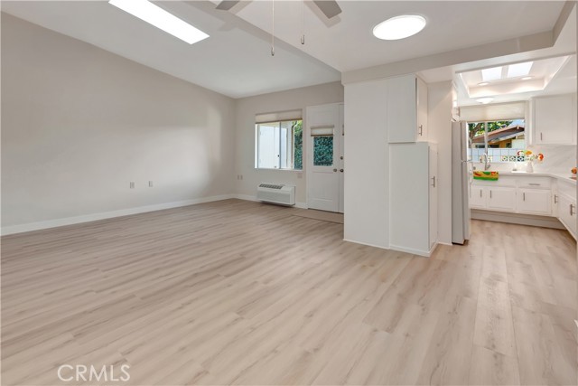 It could be your next home for many years ahead! This lovely Granada-model cottage, set on a peaceful walkway leading to Aliso Creek, has just been beautifully refreshed. The home features smooth ceilings, three skylights, and three solar tubes bringing in abundant natural light. The kitchen has a raised quartz countertop with a new sink, faucet, garbage disposal, and dishwasher. All walls, ceilings, and cabinets were freshly painted. The living room has a newer wall heat/cooling unit and the master bedroom a new wall heater. The large bathroom offers a new vanity matching the kitchen countertop, and a reglazed tub. All windows have new screens and Hunter Douglas Applause blinds. Luxury vinyl flooring runs throughout. The atrium with a partial cover adds more light and provides a perfect spot to enjoy your morning tea, while the open front patio faces our beautiful California sunsets. HOA landscaping was just completed with new greenery planted. Fantastic location and immaculate condition—bright, light, and move-in ready! Hurry! Located within Laguna Woods Village, residents have access to a wide range of amenities including Clubhouse 1 with an Olympic-sized swimming pool, Bocce Club, gym, archery range, and more. Enjoy the 27-hole championship golf course, 9-hole par-3 course, driving range, seven clubhouses, five swimming pools, a state-of-the-art fitness center, tennis and pickleball courts, walking trails, and arts & crafts studios. Laguna Woods is a gated 55+ community, just minutes from Laguna Beach and the Pacific Ocean.