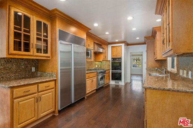 Updated Spanish home in prime Brentwood Flats location. This charming remodeled home features four generously-sized bedrooms and 3.5 baths. Many of the original detailing still intact. Hardwood floors, arched windows and doorways, gorgeous moldings and built ins add a nice sense of style against the backdrop of many modern conveniences.. Formal entry leads to the very spacious living room complete with a beautiful fireplace. The amply sized formal dining room provides easy access to the modern and upgraded gourmet kitchen equipped with stainless steel appliance. The family room with yet another fireplace opens seamlessly to the kitchen and also out through French doors to the beautifully landscaped backyard. A powder room, laundry room and a downstairs bedroom and bath complete the first level floor plan. Upstairs, the primary suite features a sitting area, a balcony, a walk-in closet and a spa-like bathroom. Two other secondary bedrooms share a bath, Jack and Jill style. Out back, there's a lovely deck space for easy al fresco lounging and dining, a refreshing pool and spa and a grassy area. the converted garage functions as a bonus room in the back yard. Air conditioning is upstairs only. Views of the pool and backyard from the master suite and family room. Square footage number is from an appraisal and is not guaranteed