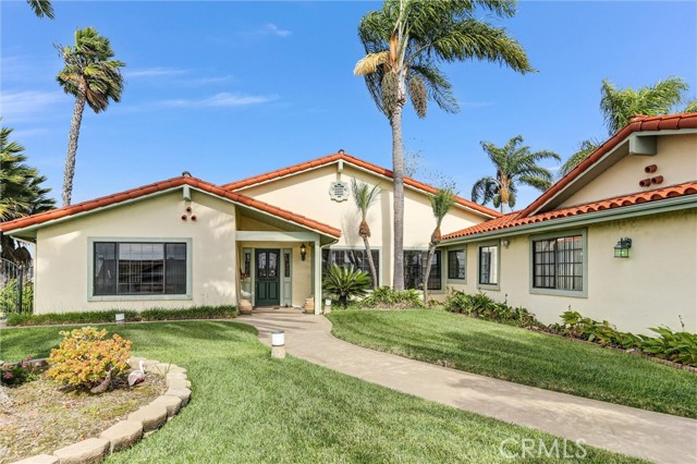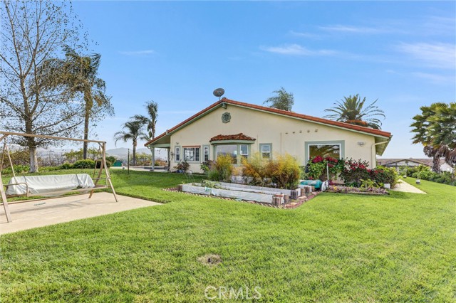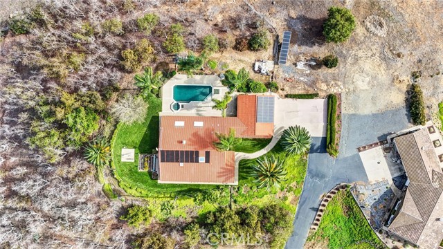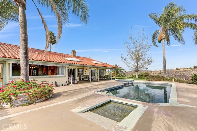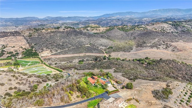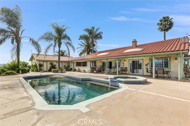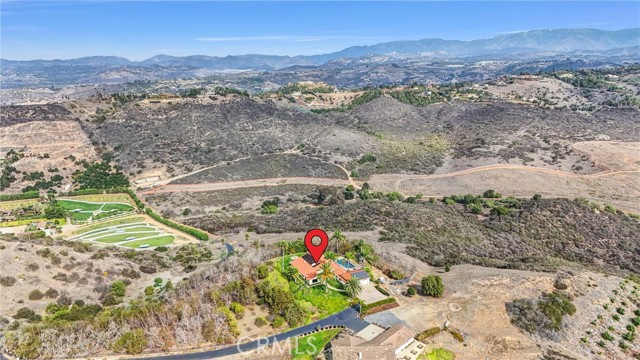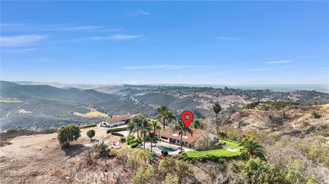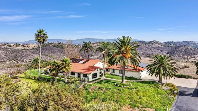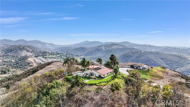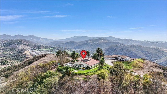 Motivated seller! Spectacular view home situated on nearly 5 acres at the top of a private hill. Fully fenced and surrounded by sweeping 360° mountain and distant ocean views on clear days. Located within a private community with its own gated entrance, this four-bedroom, two-and-a-half-bath home offers over 3,100 sq. ft. of living space and an attached three-car garage. Inside, a formal dining room, a spacious game room—including a pool table. The chef’s kitchen features granite countertops and a large pass-through folding window that opens directly to the pool area, making indoor-outdoor entertaining effortless. The primary suite is designed for comfort with a two-sided fireplace, a generous walk-in closet with a built-in, bolted safe, and sliding doors that lead to the pool and spa. Natural lighting throughout the home, and the property includes newer dual AC and heating units. The grounds feature a producing avocado grove of approximately 500–600 trees, with a few fruit trees as well. Enjoy a pool and spa with stunning views, along with a designated dipping pool area for pets. The home is energy-efficient with paid solar, as well as solar system for the pool and spa. A new backup generator was installed just over a year ago. Located on the outskirts of town for privacy while still only minutes from shopping, dining, and entertainment. Seller is offering the property as-is—and is priced to help update property interior and make it your own. A rare opportunity you won’t want to miss.