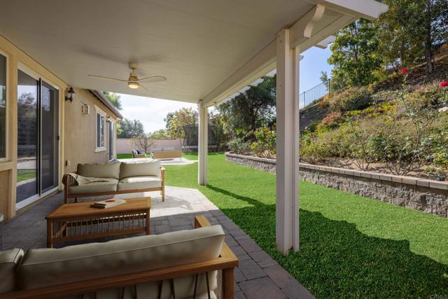 Coveted single-level home on one of the largest corner lots in the Arrowood golf community, with no Mello-Roos. Enter through a gated front courtyard leading into this open-concept home with multiple living spaces. Kitchen boasts large center island, quartz countertops, stainless appliances, custom glass-inlay backsplash, and abundant cabinetry for storage. Spacious great room with fireplace and sliding doors open to the backyard. The primary suite lives indoor-outdoor with pergola-covered patio, and features a walk-in closet, ensuite bath with dual vanity, soaking tub, and glass-enclosed shower. The expansive wraparound backyard has a hot tub, multiple seating areas, fruit and avocado trees, and a garden with multiple raised planter beds. Other highlights include plantation shutters throughout, central AC, and 3-car garage adding flexibility for gym, workspace, or storage. Community amenities include a Jr. Olympic pool, bbq, clubhouse, playground, walking trails, alongside the Arrowood 18-hole Championship Golf Course. Zoned for the Bonsall Unified School District and walking distance to Bonsall West Elementary. Minutes to Camp Pendleton and close to dining, shopping, parks, and hiking.