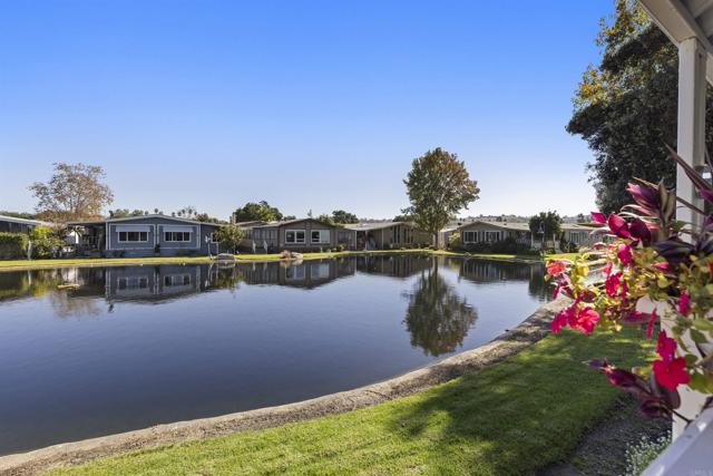 Recently remodeled located on fabulous lake view lot! You can exit the great room area thry 12 foot sliding door to a huge deck that gives you view of the lake and watch the sun come up as well as the multiple ducks, turtles. This senior park (55+) has 8 lakes, acres of green belts filled with emerald green lawn, trees and flowers. This is a very unique location about 4 miles from sandy beaches, commuter trains, Oceanside pier. This property looks and feels like a stick built home that costs thousands of dollars more yet there is RENT CONTROL that keeps your monthly overhead very comfortable. The remodel is extensive and includes most of the home including a tankless water heater outside (see complete list of upgrades when you visit)! Park tennis/racketball court, year round heated pool, indoor spa, huge very classy club house with library, pool tables, card rooms where there are banquets and a stage for live music and a host of other very fun activites! You are close to grocery stores, medical services, Walmart. Lowes, Home Depot, exellent restaurantrs with a huge variety food! There is also a huge over size shed (12x10x10 for lots of storage. Come take a look at this unit that will make you feel like you are living in a secluded oasis!
