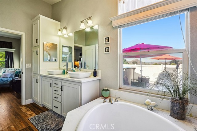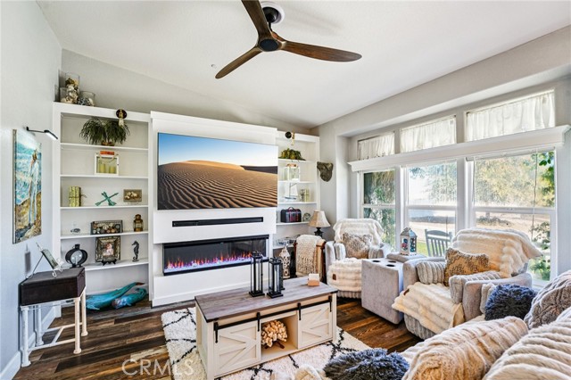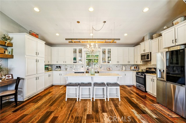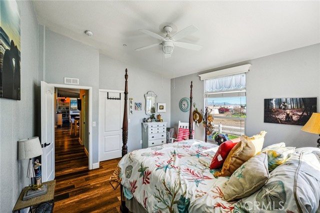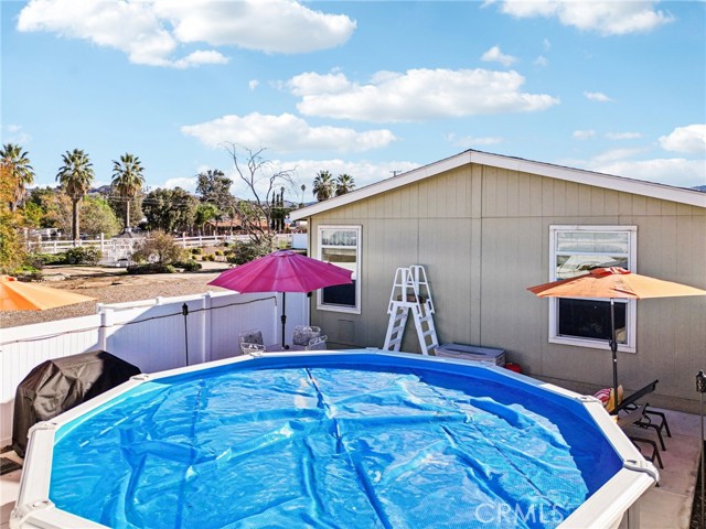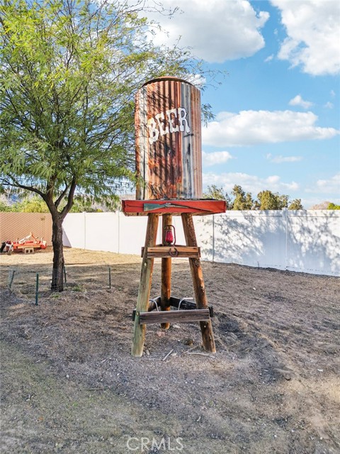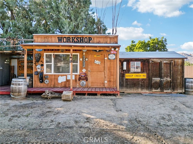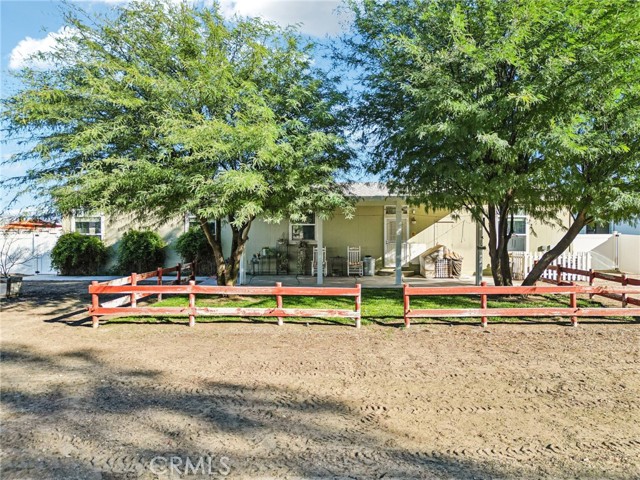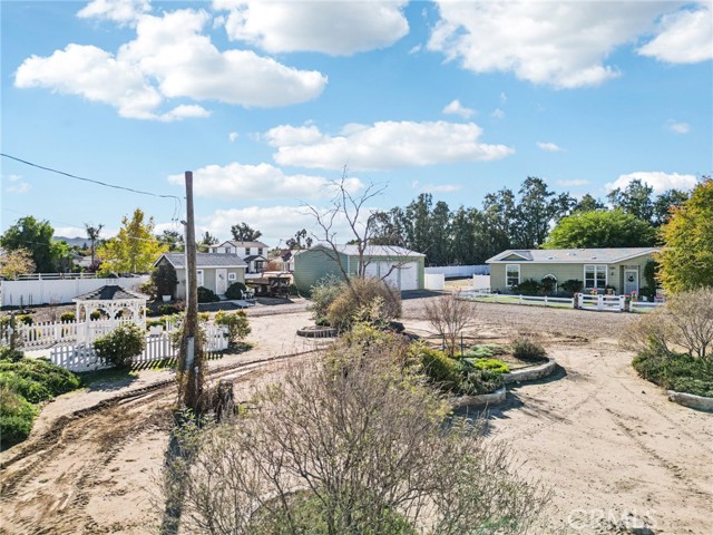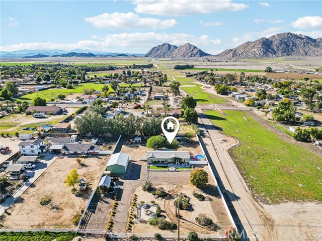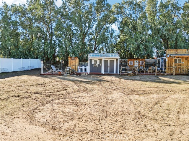 Welcome to 19957 Hansen Ave, a beautifully upgraded 1,814 sqft, 3-bedroom, 2-bath home set on a flat, fully usable one-acre lot in Nuevo. This unique property is fully enclosed with vinyl fencing and includes an impressive 40’ x 30’ metal shop/garage perfect for storage, projects, or hobbies. Behind the home sits an incredible full Western town complete with four custom buildings and a party deck. The saloon is equipped with air conditioning, while the blacksmith shop offers 60-amp power for welding. Additional conveniences include a dedicated RV hookup with 60-amp service and water, as well as an expansive assortment of plants and trees throughout the property, all maintained by irrigation timers. Step through the front door and you’re welcomed by a modern country ambiance highlighted by distressed wood laminate flooring, tall baseboards, vaulted ceilings, large windows, and tasteful lighting. The great room is truly the heart of the home, with the stunning kitchen at its center. Shaker style white cabinets, quartz countertops and backsplash, a farmhouse sink, hideaway trash can, stainless steel appliances, and a large island with bar seating create a perfect blend of style and functionality. The kitchen opens seamlessly to the dining area and family room, where a custom built-in entertainment center showcases a large flat screen TV, sound bar, and 3D fireplace, making the space ideal for relaxation and entertaining. The spacious primary suite features vaulted ceilings and an en-suite bathroom with dual sink quartz vanities, a large soaking tub, and a separate shower. Two additional bedrooms offer generous space, and the home includes a dedicated laundry room for added convenience. Outside, a concrete pad accommodates the 15-foot above-ground pool, complete with an upgraded pump and filter, providing a refreshing retreat during warm summer months. This one-of-a-kind property blends modern comfort with rustic charm and offers endless possibilities.