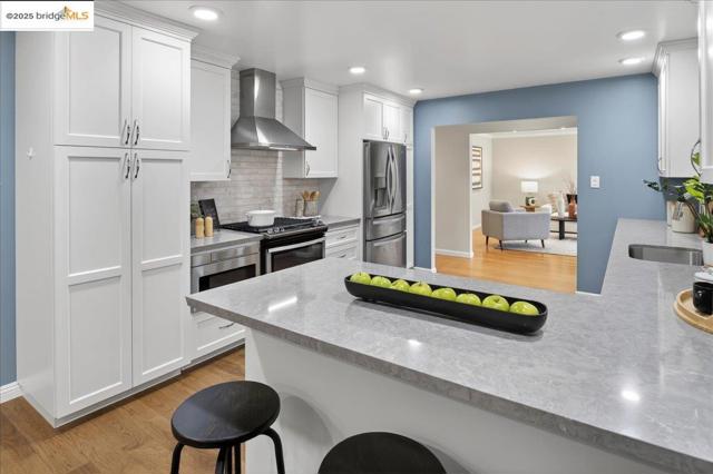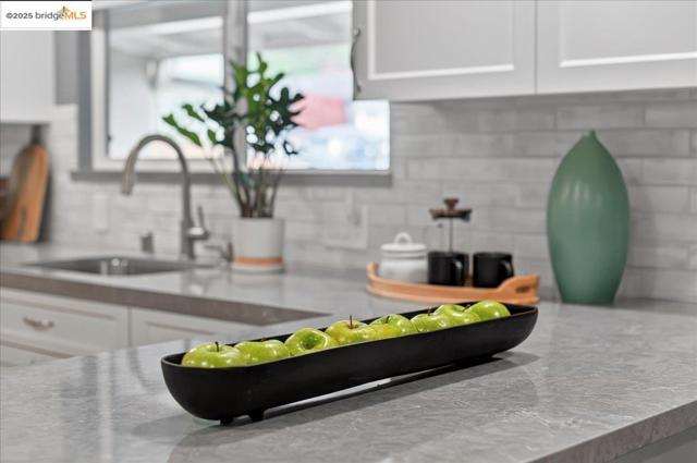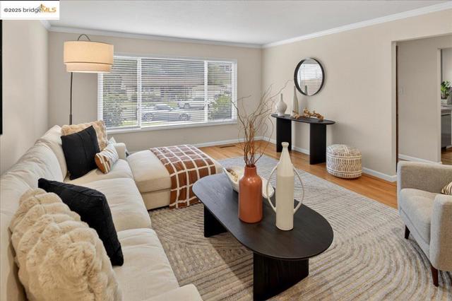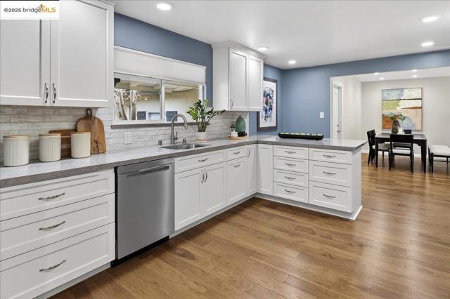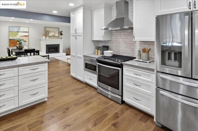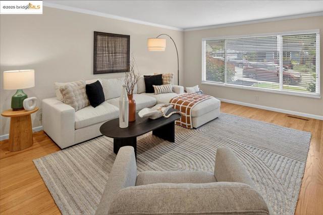 Stellar location and a fantastic floor plan! This beautifully updated, almost level-in single-level home is nestled in coveted Upper Castro Valley, close to highly acclaimed schools. Modernized throughout, it features a stunning chef’s kitchen with quartz countertops, custom subway tile backsplash, premium stainless appliances including a gas range and hood, and classic white shaker cabinets. Warm engineered wood floors flow into the dining area and family room, highlighted by a timeless brick fireplace with a gas insert. From here, step out to a private backyard with a patio and lawn for entertaining, plus a terraced area ideal for raised beds and gardening. A separate living room provides an extra retreat or flexible use space. The home offers three bedrooms, including a refreshed primary suite; both bathrooms are updated with newer vanities, large-format tile, and seamless glass shower doors. Additional upgrades include crown molding, newer baseboards, recessed lighting, and newer windows. A two-car attached garage with laundry area—washer and dryer included—completes this move-in ready home.