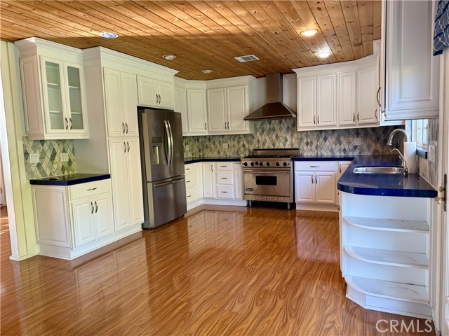 WONDERFUL WOODLAND HILLS HOME FEATURES KNOTTY PINE CEILING IN LIVING ROOM AND KITCHEN, THE KITCHEN IS VERY ROOMY HAS RECESSED LIGHTING, A STAINLESS STEEL VIKING 6 BURNER STOVE AND MATCHING DISHWASHER. THE KITCHEN COUNTER OVERLOOKS THE BACKYARD THROUGH LARGE WINDOWS, SPLASHING THE ENTIRE KITCHEN WITH LIGHT. HAVE FRIENDS OVER FOR THE BIG GAME, OR FAMILY ON HOLIDAYS AND SPECIAL OCCASIONS, AND ENTERTAIN THEM IN THE ENORMOUS DEN WITH IT'S OWN BACKYARD ENTRANCE. DEN ALSO BOASTS A WOOD BEAMED CATHEDRAL CEILING AND IT'S OWN FIREPLACE. ENJOY A BACKYARD BBQ WITH PLENTY OF SPACE FOR EVERYONE. FAMILY ORIENTED NEIGHBORHOOD MAKES THIS HOME VERY DESIRABLE.