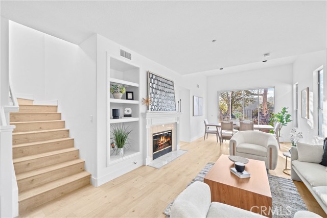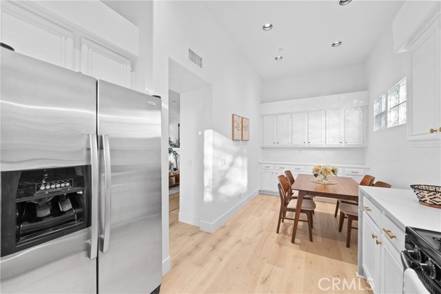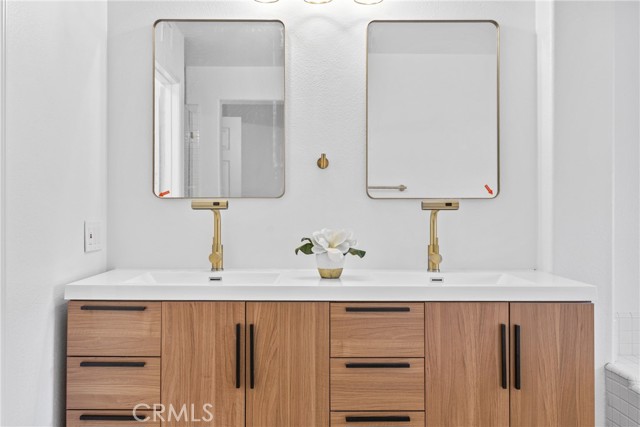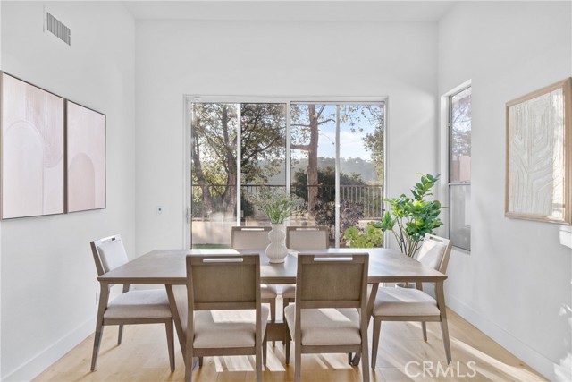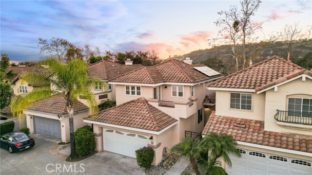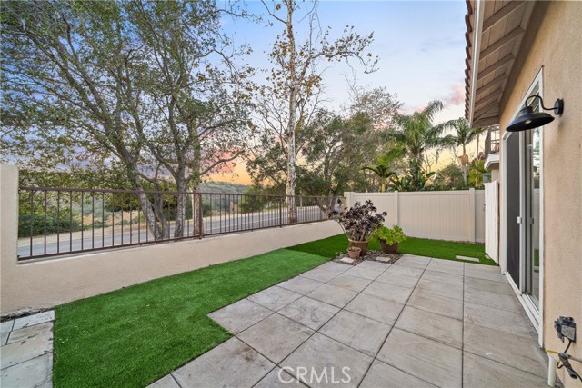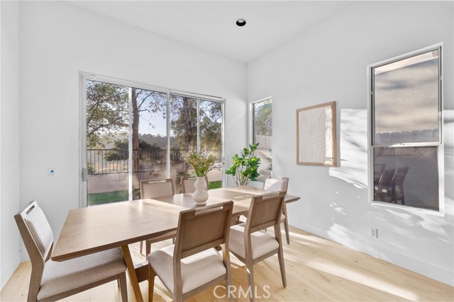 An exquisite residence, meticulously remodeled to offer an entirely turn-key living experience, is situated in the tranquil, highly sought after enclave of Villavante. This magnificent, detached single-family home is gracefully nestled just moments from the spectacular Tijeras Creek Golf Course, offering a lifestyle of serenity and sophistication. The expansive, open floor plan spans 1,712 square feet of thoughtfully designed living space, promising both comfort and elegance. Step inside to discover immaculate hardwood flooring that flows seamlessly throughout the entry, formal living room, and sophisticated dining area. The main level features a versatile room, currently configured as a refined office or den, complete with a discreet, built-in Murphy bed—an ideal accommodation for esteemed guests. A convenient main-floor bathroom and shower enhance the home’s functional elegance. The culinary heart of the home, the extra-large kitchen, is a chef's delight, boasting rich wood cabinetry, lustrous quartz countertops, and top-tier stainless-steel appliances. A bright breakfast nook provides a welcoming space for casual dining. Ascend to the upper level to find the indulgent, oversized master suite, which features a private walk-out patio deck, a luxurious bathroom suite with a Roman tub and separate shower, and an extensive walk-in closet. The generous third bedroom upstairs offers privacy and comfort with its own dedicated full bathroom. This home is bathed in natural light, enhanced by abundant windows and a fresh, bright new designer interior paint. The serene outdoor living space is a true sanctuary, offering peaceful canyon views from a well proportioned yard featuring a patio and low-maintenance artificial turf which are perfect for sophisticated entertaining. The property is equipped with a high-quality, fully paid-for solar energy system, reflecting a commitment to modern efficiency. A spacious garage with durable epoxy floors and extensive built-in storage completes the home's exceptional offerings. Residents will enjoy immediate proximity and access to the community pool and spa, and all the fabulous amenities Rancho Santa Margarita (RSM) provides, recognized as one of the safest cities in California. The location affords unparalleled access to the community lagoon, fishing, numerous pools, tennis and pickleball courts, extensive hiking trails, and a variety of wonderful shops and esteemed restaurants. Welcome home.