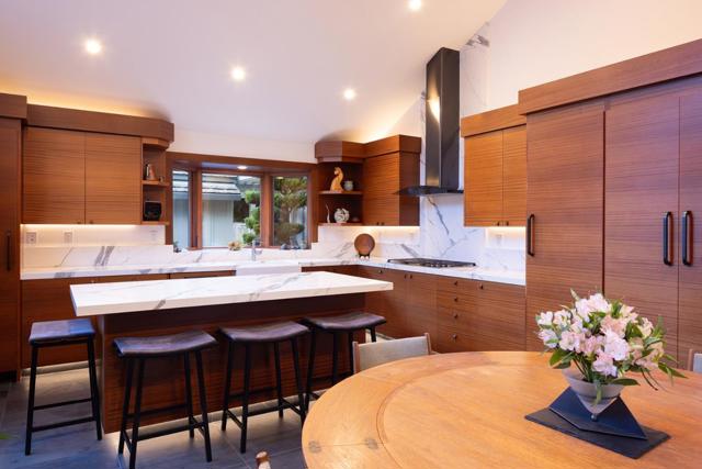 This stunning remodel features a freestanding unit designed with both comfort and versatility. The spacious layout includes two primary suites as well as a den which can easily serve as a third bedroom. The home has three bathrooms providing convenience for residents and guests. The sunny kitchen is equipped with a functional island, making it ideal for casual meals and for entertainment. There is a designated dining area within the kitchen enhancing the home's open and welcoming atmosphere. Porcelain countertops are featured in both the kitchen and bathrooms, adding a touch of elegance. The spacious living room includes a gas fireplace, perfect for cozy evenings. Open beam ceilings add interest and spaciousness. Flooring is a mix of slate and carpet, offering style and comfort. Enjoy three outdoor fenced patios which are wonderful for your pets and privacy. New warm wood cabinetry, complete solar power and a double car detached garage offer convenient and secure parking.