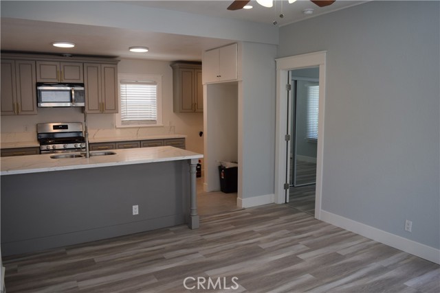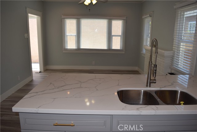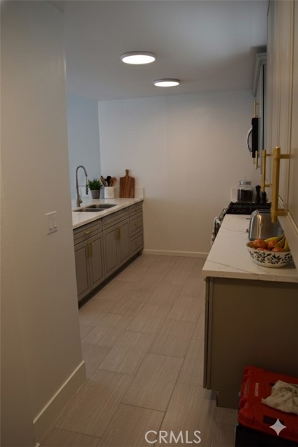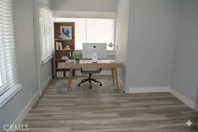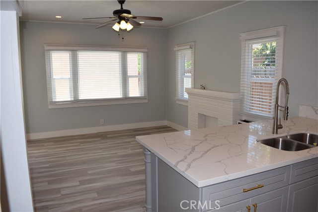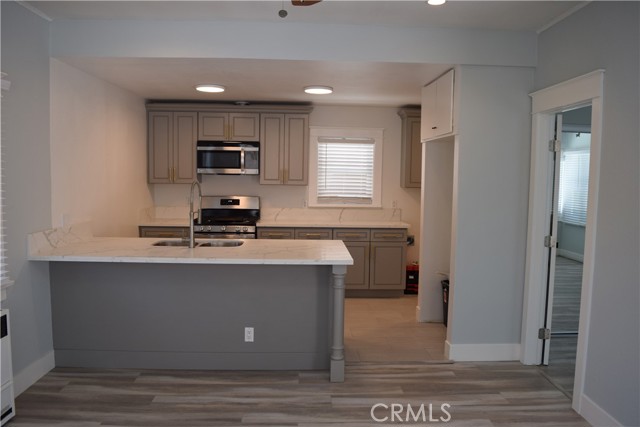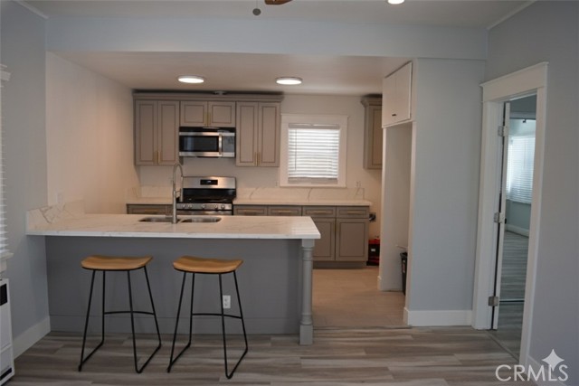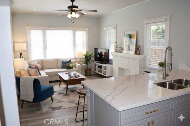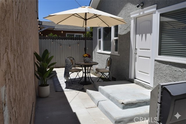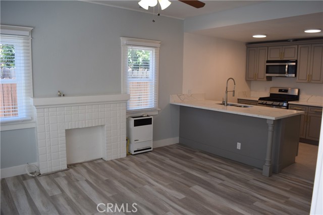 Charming stand-alone home with an enclosed patio in a quadplex (3rd unit in). Features newer kitchen cabinets, stainless steel stove and microwave, and Carrara quartz countertops with a built-in breakfast bar. Cozy faux fireplace. Oversized one-car garage. The bedroom includes a pop-out area, ideal for a home office. Convenient washer/dryer hookups off the kitchen. Updated tile in the kitchen and laminate flooring throughout. All-new dual-pane Milgard windows that open and close smoothly. Short walk to the private garage in back.