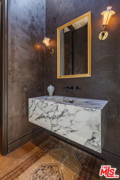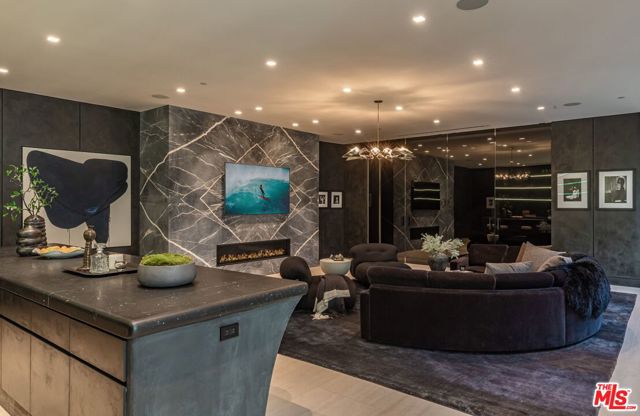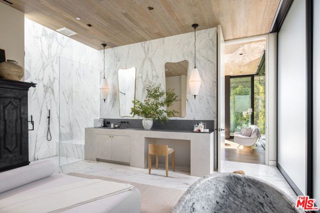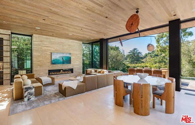 Discover world-class design and luxury in this organic contemporary Trousdale masterpiece crafted by award-winning architect Paul McClean and designer Lindsay Chambers and reimagined by Nate Berkus & Jeremiah Brent. Set on a prestigious, quiet cul-de-sac, this 11,000 SF home boasts an architectural exterior with custom Italian stonework. Mid-century-inspired steel grillwork surround the front door that opens to a showstopping glass bridge entrance. The two-story courtyard and walls of glass allow sunlight to fill the home and highlight the beautiful oak ceilings and Travertine walls. Glass walls open to a spectacular outdoor space featuring an expansive infinity pool with city and ocean views and a tranquil Japanese garden. The primary suite sits beside the pool as if it's floating above the water and offers a custom walk-in closet, and spa-like bathroom. Rejuvenate in the marble-clad indoor wellness center with hot and cold plunge, cedar sauna, and gym. Additional amenities include a stunning Nero Marquina-clad bar, home theater, subterranean auto gallery, and fairytale pink playroom. This architecturally significant home is a rare offering, even among the most discerning tastemakers in the city.
