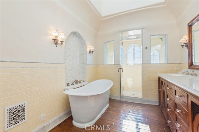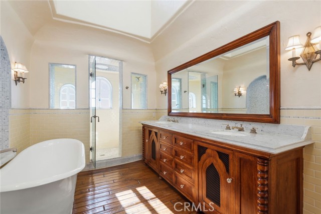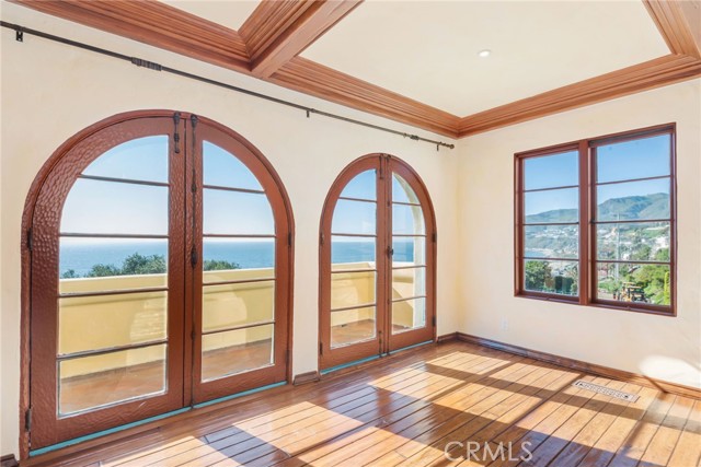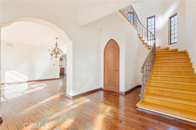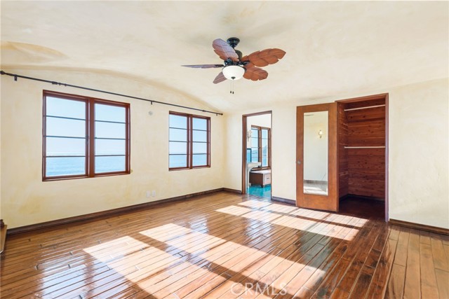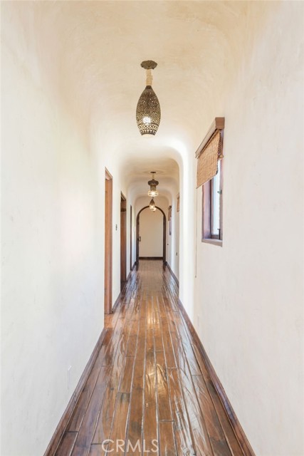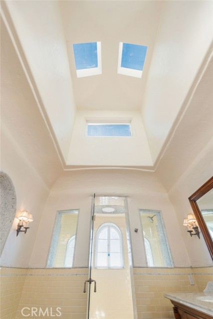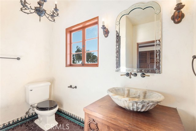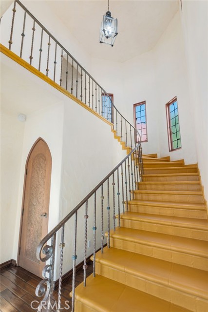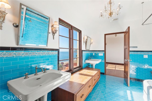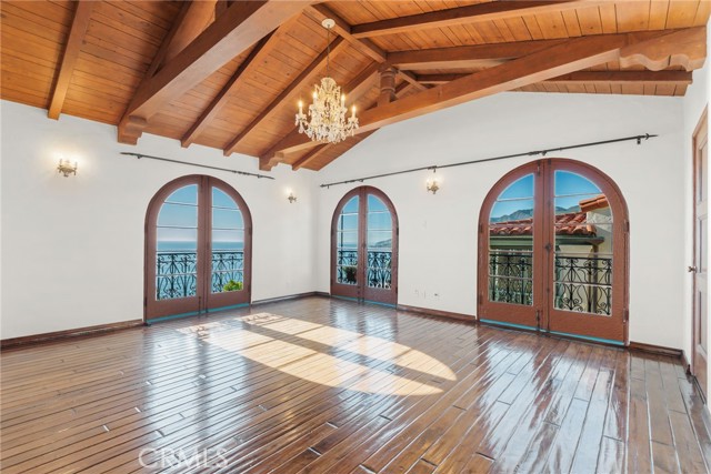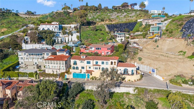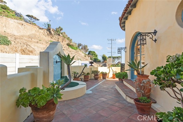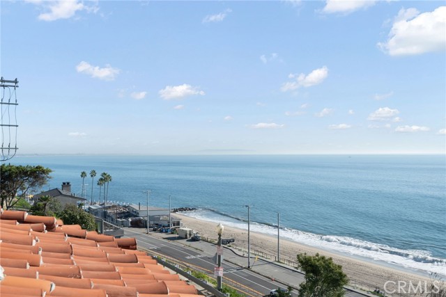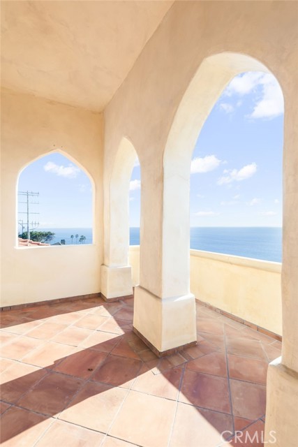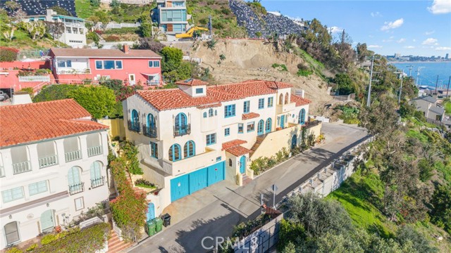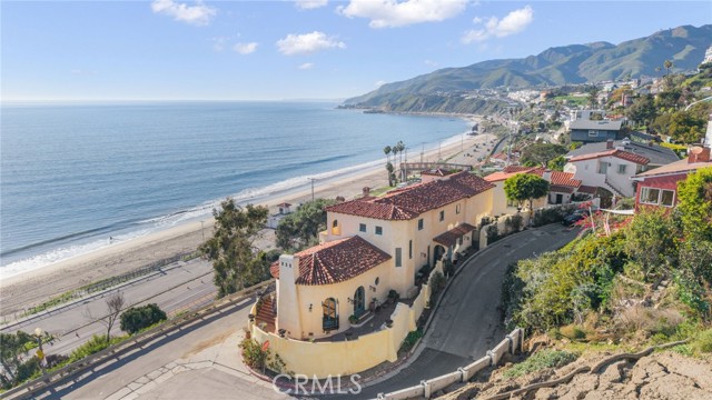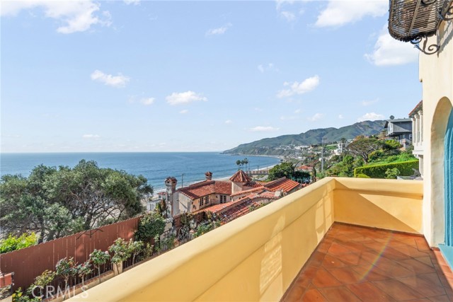 Perched on the hillside of Pacific Palisades overlooking the ocean, this 3,998 sqft residence is a stunning example of 1920s architecture. The home offers incredible ocean and coastline views, allowing you to enjoy a short trip to the beach or simply listen to the waves at night. The villa is defined by its truly unique architectural details, featuring intricate stained glass windows, classic arched doorways, and exposed wood beams that capture the character of the era. The distinct floor plan is functional across three levels. The main living level (2nd floor) boasts an amazing great room with high ceilings and a grand fireplace, a formal dining area, a family room, and a chef's kitchen. This level offers access to a plethora of viewing areas from the wrap-around patio and multiple balconies, providing an exquisite space for entertaining. The upper level (3rd floor) contains the primary suite with walk-in closets, an ensuite bathroom, and a private water closet, along with two additional bedrooms that share a Jack and Jill style bathroom. The lower level offers direct access to the 3-car garage and features a private guest suite with its own ensuite bathroom, perfect for guests or staff.