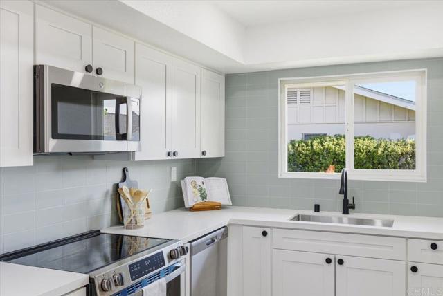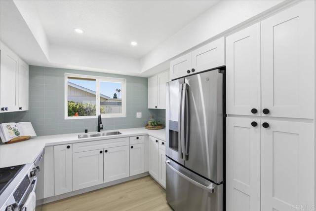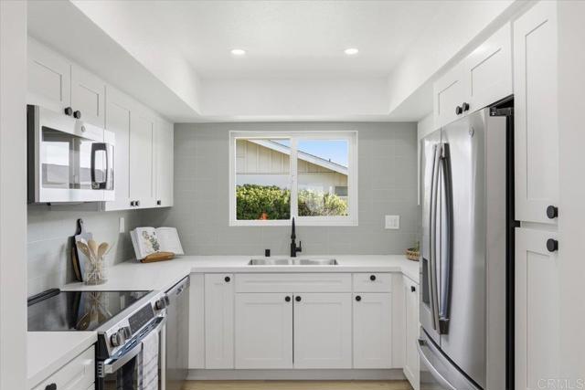 Experience coastal living in this beautifully fully remodeled one story 3 bedroom, 2 bathroom Oceana home in the heart of Oceanside’s sought-after 55+ community. Every detail has been upgraded to create a light, modern, and inviting space perfect for relaxed North County living. The kitchen shines with white shaker cabinets, soft blue backsplash tile, quartz countertops, modern black cabinet pulls, built-in pantry area and stainless steel appliances. Clean lines, new fixtures, and an abundance of natural light make this kitchen feel fresh and coastal. The bathrooms were thoughtfully redesigned. Primary suite featuring designer green vertical tile, a frameless sliding glass shower door, matte black fixtures, and a warm wood vanity. The entire home features light wood style LVP flooring, new doors and door paint. A brand new roof and replaced vinyl windows and doors throughout give peace of mind. Enjoy ocean breezes and ocean views from your living spaces and secondary bedrooms along with a spacious private patio perfect for morning coffee or evening relaxation. The home includes a detached one car garage and in home laundry hookups, giving you convenience and privacy. Oceana is known for its incredible amenities and vibrant lifestyle. The community offers multiple pools, spas, clubhouses, pickleball, barbecue areas, a library, a woodworking shop, walking paths, social clubs, and beautifully maintained greenbelts. It is located just minutes from shopping, restaurants, medical facilities, golf courses, and world class beaches. This location offers easy access to everything that makes North County San Diego one of the most desirable places to live. This is coastal Oceanside living at its best.