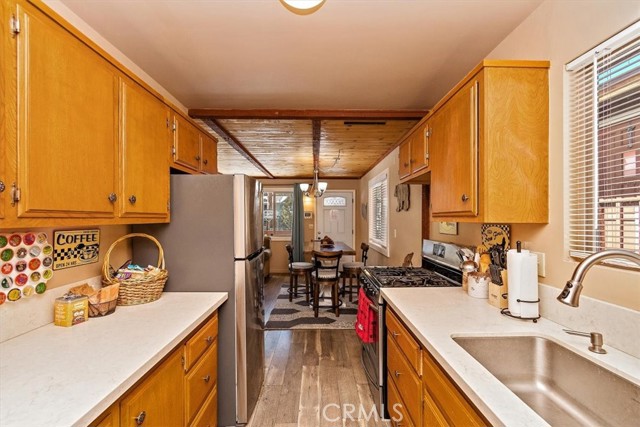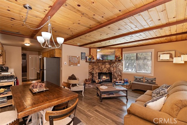 Charming and easy-living mountain chalet tucked away on a quiet street, just approximately 500 feet from trailheads into the San Bernardino National Forest. This warm and inviting home features a welcoming front deck, a striking stone wood-burning fireplace, and an open living and dining area ideal for relaxed mountain living. The galley-style kitchen offers a gas range and refrigerator, while two well-sized bedrooms provide generous closet space. The home is clean and well cared for, with low-maintenance luxury vinyl flooring throughout and dual-pane windows that fill the space with natural light. A sliding glass door off of one of the bedrooms leads to a recently added back patio complete with a private spa—perfect for unwinding under the stars. Additional highlights include two gravel parking spaces at the front of the chalet and a stackable washer and dryer included in the lease. Some storage is available under the home in the build up area. The property is offered unfurnished. Photos reflect staged furnishings and are not indicative of how the home will be leased. To apply for tenancy: https://apply.link/3U7ZIdk