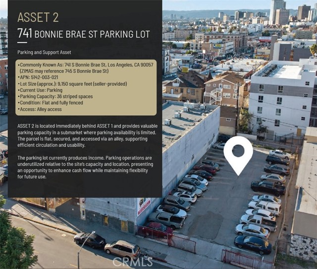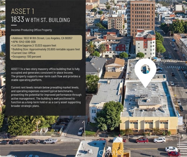 Updated as of 4/15/2026.-AUCTION SALE: Century 21 Masters and FRE Auctions are pleased to present this Online Auction Plus Event. STARTING BID: $1,500,000. PACKAGE INCLUDES TWO ADJACENT ASSETS. • ASSET 1: Fully occupied two-story office building located at 1833 W 8th Street (APN: 5142-006-009), totaling approximately 20,600 rentable square feet on an approximately 12,023 SF C2-1 zoned lot, providing stable in-place income with significant upside as current rents are below market, offering a strong opportunity to stabilize and increase cash flow. The asset reflects an estimated 5%–6% in-place cap rate based on current NOI and generates approximately $400,000 in gross annual income with stable occupancy (26 tenants). • ASSET 2: Separately parceled parking lot located at 741 S Bonnie Brae Street (APN: 5142-003-021), featuring approximately 36 striped spaces with alley access on an approximately 9,150 SF R4-1 zoned lot, offering existing income and strategic value in a dense, transit-oriented area with limited parking supply. The assets are adjacent and operate as a unified investment, offering control of income, parking, and future optionality. Combined land area is approximately 21,173 square feet, near Downtown Los Angeles and Koreatown. Property offered via auction with reserve. All offers must be submitted through the auction platform. Seller reserves the right to accept, reject, or negotiate offers prior to or after the bidding period. Buyer to assume all existing tenants. Property sold AS-IS. All information deemed reliable but not guaranteed. Buyers to conduct their own due diligence.
