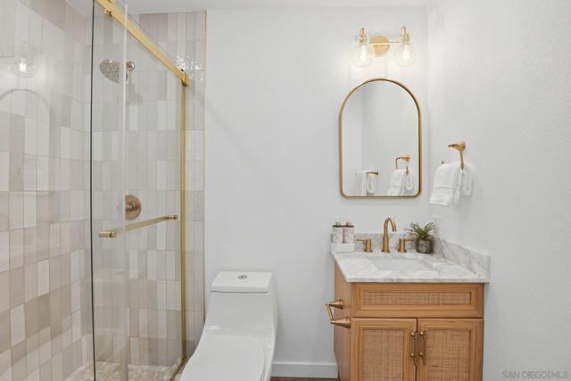 Totally remodeled, turnkey 3BR/2BA single-level home in the highly desirable 55+ community of High Country Villas in Encinitas. Bright, modern 1,056 sq ft with new luxury vinyl plank flooring, fresh interior paint, and a custom marble fireplace. Stunning updated kitchen with sleek cabinetry, natural stone countertops, and stainless appliances. Both bathrooms fully renovated with tiled showers, new vanities, and modern fixtures. Spacious primary suite plus two secondary bedrooms ideal for guests, office, or hobbies. Private patio with mountain views—perfect for morning coffee and sunset evenings. Resort-style amenities include pool/spa, 9-hole golf, clubhouse, pickleball, and walking trails with a low monthly HOA. Minutes to beaches, shopping, and dining—turnkey 55+ living at its best. Welcome home to a completely remodeled, turnkey 3-bedroom, 2-bath residence in the highly sought-after 55+ community of High Country Villas in Encinitas. This single-level home offers 1,056 sq ft of bright, modern living with thoughtful upgrades throughout. Step inside to a fresh contemporary interior featuring new luxury vinyl plank flooring, all-new paint, and a custom marble fireplace that anchors the living space. The kitchen has been fully reimagined with sleek cabinetry, natural stone countertops, and stainless steel appliances—perfect for everyday living or entertaining. Both bathrooms have been beautifully upgraded with tiled showers, new vanities, and modern fixtures. The spacious primary suite includes an updated en-suite bath and generous closet space, while two additional bedrooms offer flexibility for guests, a home office, or hobbies. Enjoy two private patios, one with mountain views—ideal for morning coffee and sunset evenings. High Country Villas delivers a relaxed, resort-style lifestyle with amenities including a pool and spa, 9-hole golf course, clubhouse, pickleball courts, and scenic walking trails—all with a low monthly HOA. Just minutes to beaches, shopping, dining, and everything coastal North County has to offer, this home pairs modern upgrades with the easygoing Encinitas lifestyle. Move-in ready 55+ living at its best.