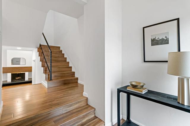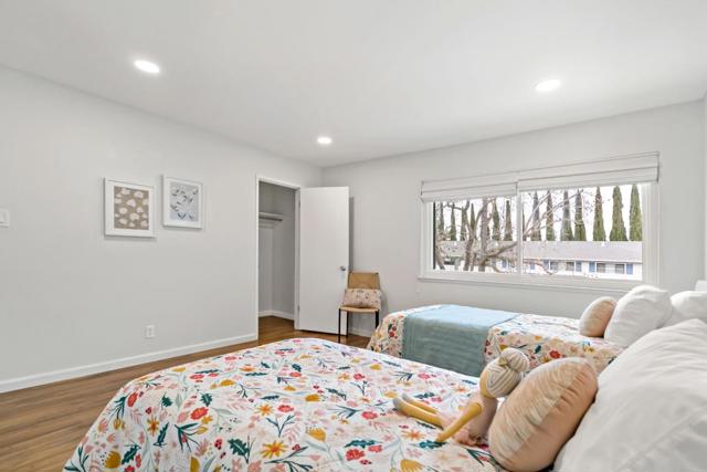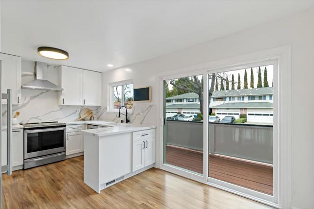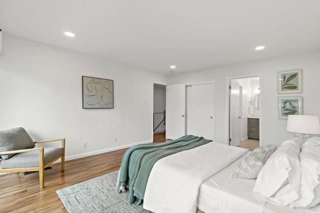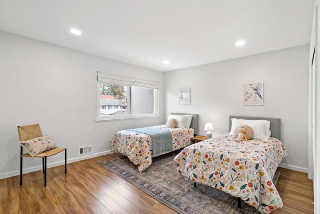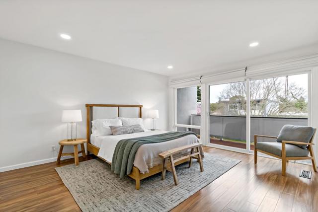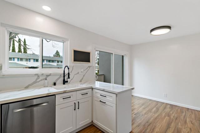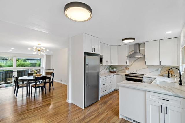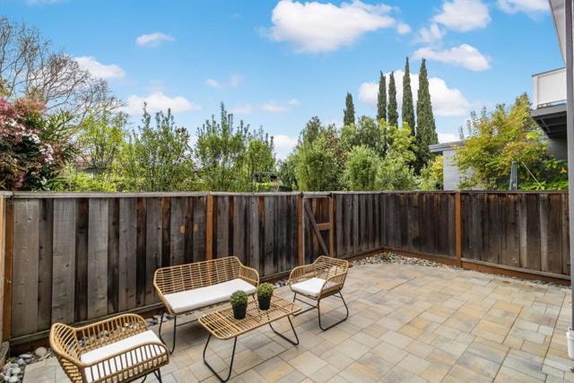 Tucked away on a quiet street, this beautifully updated three-bedroom, two-and-a-half-bath home offers the comfort and feel of a single-family residence, complete with a two-car garage and private driveway. Hardwood floors run throughout, complemented by high ceilings in the living room, recessed lighting, skylights, and abundant natural light that fills the home. The remodeled kitchen features newer fixtures and appliances, creating a modern and functional space for everyday living and entertaining. The spacious primary suite serves as a peaceful retreat with a remodeled bathroom, two closets, and a private deck. The oversized secondary bedroom also includes two closets and the third bedroom offers a convenient office nook. Freshly painted and thoughtfully. Dual-pane windows and updated finishes throughout, the home also boasts a large, sunny back patio perfect for outdoor dining and relaxation, making this move-in-ready property a rare blend of privacy, style, and livability. Common area includes a swimming pool, beautifully landscaped grounds with fruit trees, and a basketball court. Minutes from both downtown Redwood City and Menlo Park.