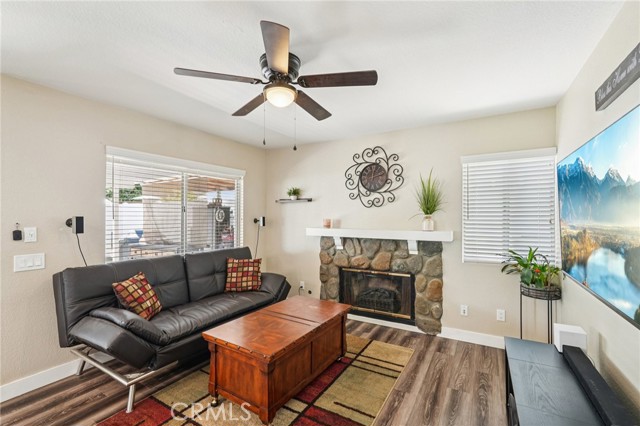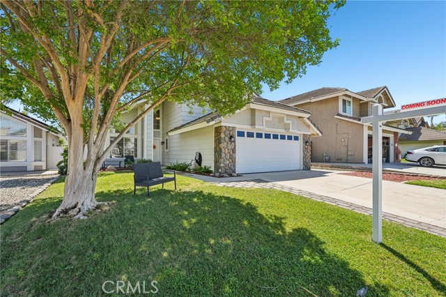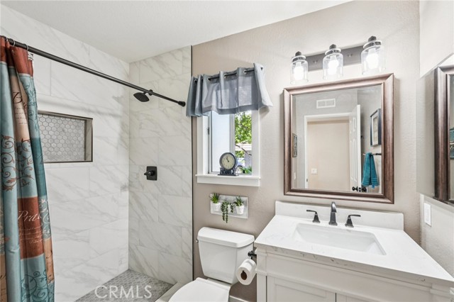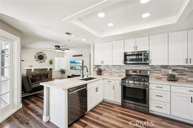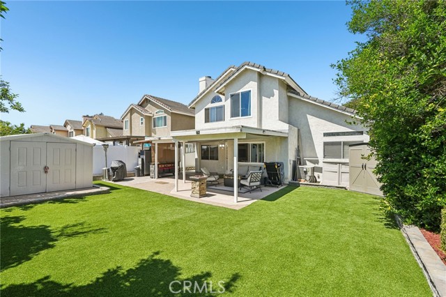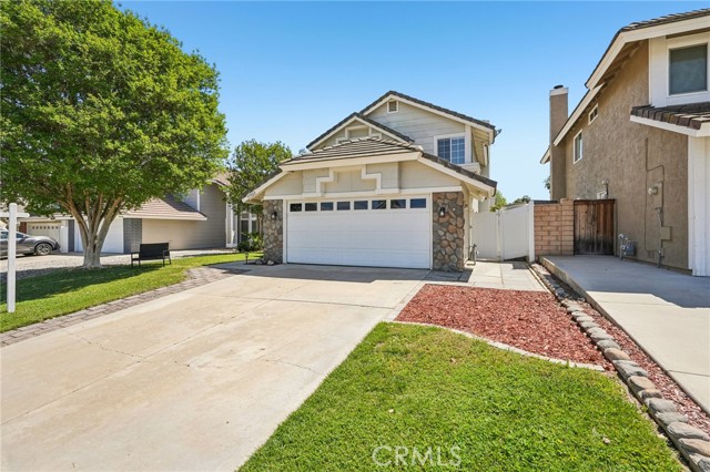 This stunning two-story home in Central Murrieta combines modern upgrades with a functional layout perfect for dual-living arrangements. Boasting exceptional curb appeal with an inviting front porch, the entry opens into a formal living and dining area featuring soaring cathedral ceilings, updated lighting, and contemporary vinyl plank flooring throughout the main level. The heart of the home is a remodeled cook’s kitchen, complete with quartz countertops, an eat-in island peninsula, and updated white cabinetry. It features a large single-basin sink, black stainless steel appliances, a tile backsplash, and recessed lighting. The kitchen flows seamlessly into the family room, which is anchored by a cozy fireplace and ceiling fan, with French doors leading to the backyard. Convenience is key with a downstairs bedroom featuring double-door entry and an adjacent fully updated bathroom boasting a new vanity, quartz counters, and a modern tile walk-in shower. Upstairs, you will find dual primary suites: Suite #1 Offers a walk-in closet and a beautifully remodeled bathroom with a custom tile shower, white vanity, and updated fixtures. Suite #2 (the true primary): An expansive retreat with an extra-large bedroom and walk-in closet. The spa-like ensuite features two new white vanities, framed mirrors, a huge walk-in glass shower, and a separate soaking tub. The exterior is designed for easy living with a covered patio, low-maintenance astro-turf, like new vinyl fencing, and a large storage shed. Located near top-rated Murrieta schools, shopping, and freeway access, No HOA and LOW TAXES! This move-in-ready gem is waiting for you!