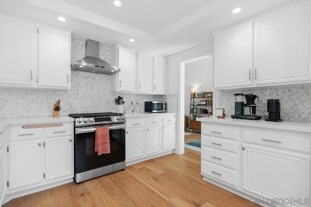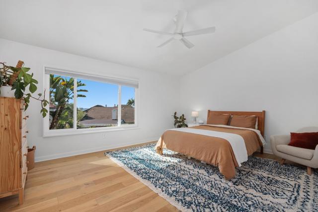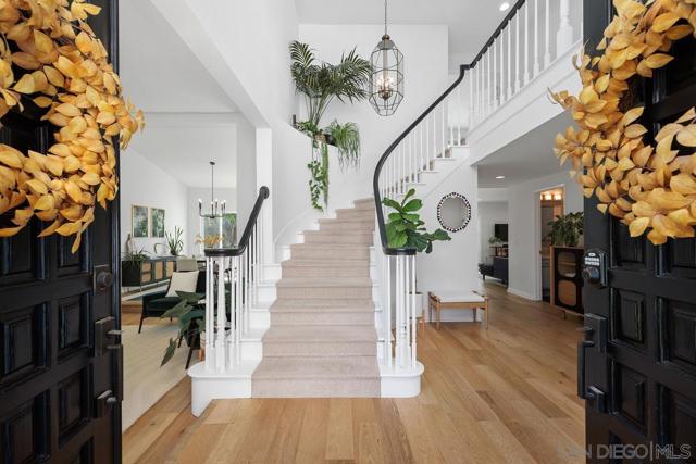 Beautifully updated, this La Costa home blends style and comfort within a thoughtfully designed floor plan featuring both formal and casual living spaces, along with a highly desirable main-floor bedroom. The first level includes inviting living and dining areas ideal for entertaining, as well as an open-concept kitchen and family room anchored by a cozy fireplace. A dedicated laundry room provides convenient access to the attached two-car garage, complete with epoxy flooring, built-in storage, and modern lighting. Upstairs, three additional bedrooms include a spacious primary suite and updated bathrooms with designer finishes, custom vanities, Silestone quartz countertops, and high-end fixtures. The light-filled interior is enhanced by large picture windows and natural oak flooring throughout. Sliding glass doors open to a generous backyard designed for both relaxation and entertaining, featuring a sparkling free-form pool and spa, ample lawn space, and an outdoor shower. Tucked away on a quiet cul-de-sac, the home is just minutes from beaches, golf courses, and top-rated schools. Move-in ready and thoughtfully upgraded, this residence offers an ideal blend of functionality, warmth, and the best of California living.