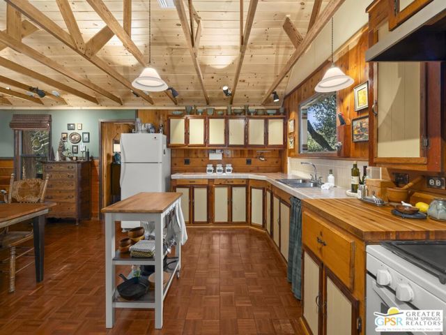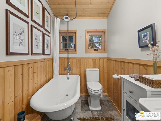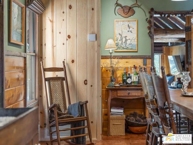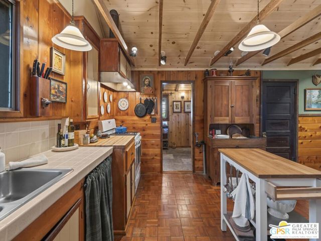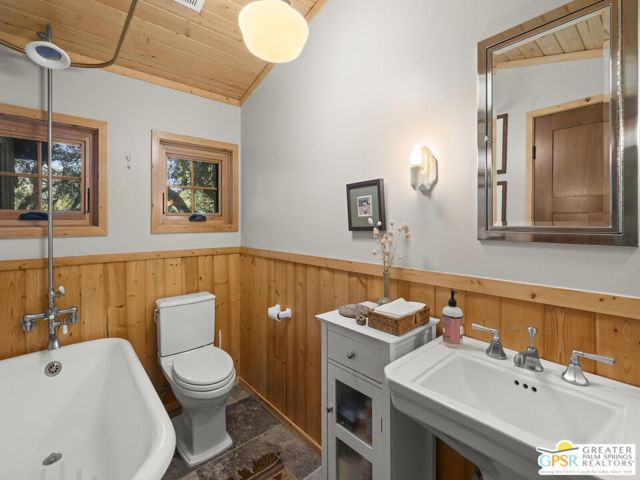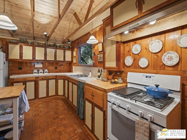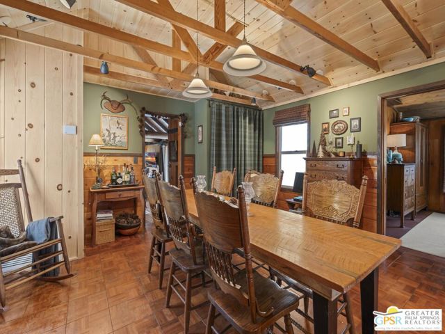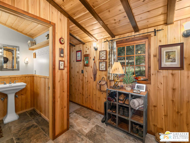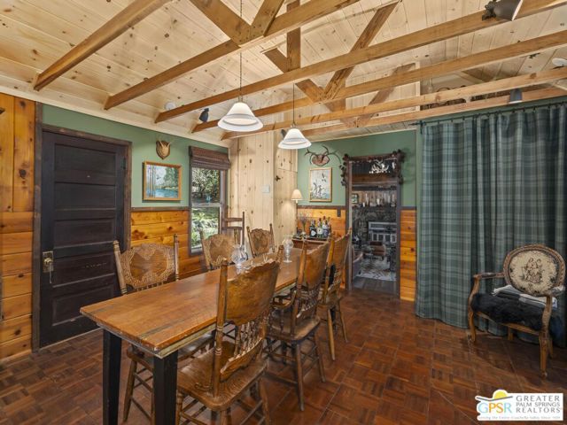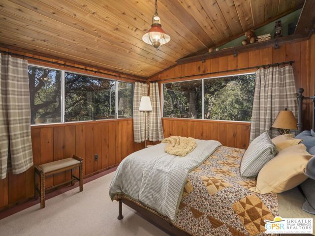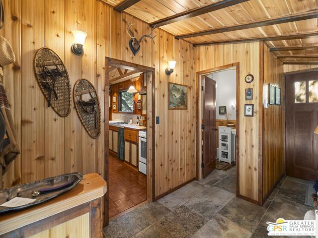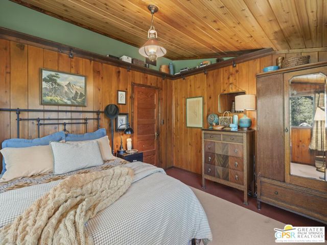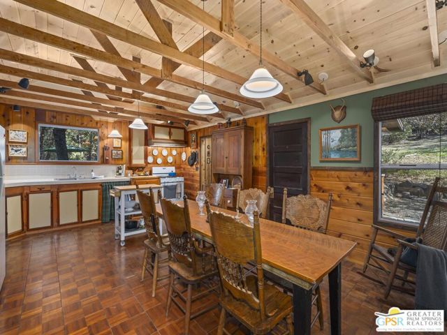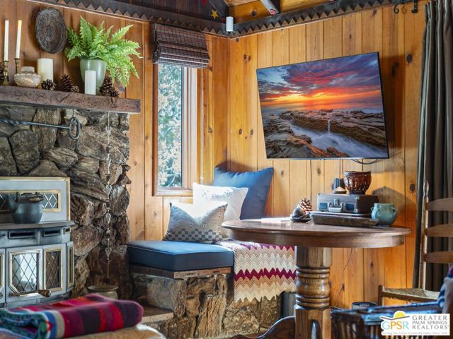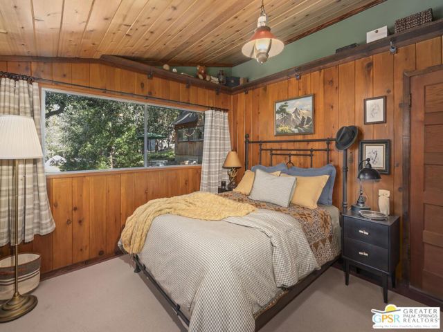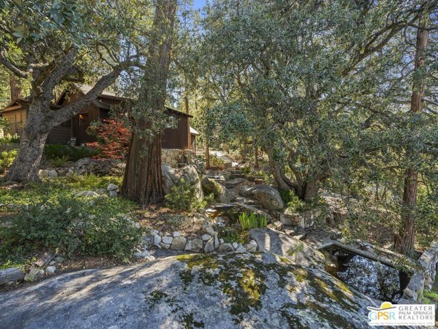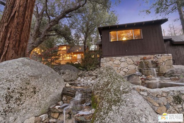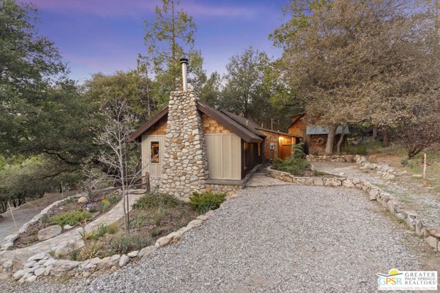 Down a quiet mountain road, a private drive winds through the trees to this cabin built in 1945, set on 0.41 acres and tucked into the hillside, a place that feels easy to settle into and hard to leave. This 1-bedroom, 1-bath retreat offers approximately 1,088 sq ft and reflects the kind of classic mountain cabin that is becoming harder to find. Vaulted ceilings with exposed beams and original pine paneling bring warmth, texture, and a true sense of character. Thoughtfully maintained and curated, its original charm remains intact. Entry begins in a mudroom with heated flooring, offering a comfortable transition inside. Straight ahead, the full bath features a clawfoot tub. To the left, the kitchen opens into a spacious eat-in area with a central dining space, wood cabinetry, tile counters, and natural light. Just beyond the kitchen, the living room opens under vaulted ceilings with a beautiful stone fireplace and wood-burning stove insert as its focal point. Playful, colorful accents highlight the wood-beamed ceilings, giving the space a distinct personality. It is the kind of room that invites you to sit down and stay awhile, where quiet mornings, evenings by the fire, and time spent together naturally turn into lasting memories. Off the right side of the kitchen, the bedroom is tucked into a quiet corner, with windows overlooking the surrounding grounds. At night, open the windows and take in the gentle sound of water and frogs in the distance. From the mudroom, a rear door leads directly outside. Just beyond the cabin, a large detached two-story structure offers flexible use. Semi-finished and ready to take shape, it could serve as a studio, workspace, or something entirely your own. The grounds unfold with stone terraces, winding paths, and multiple outdoor areas to gather or retreat. A series of cascading ponds and waterfalls move through the landscape, creating a soft, continuous rhythm of water. Lily pads and seasonal blooms add color and texture, while a drip irrigation system supports established landscaping including dogwoods, Japanese maple, manzanita, tall pines, and flowering meadows, all centered around a large, ancient oak tree that stands out as a true centerpiece of the property. Recent improvements include a newer roof, copper plumbing, upgraded electrical with a newer main panel, and central propane heating. Private, intentional, and full of character. A true mountain retreat.