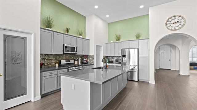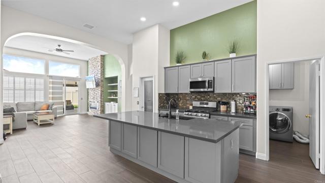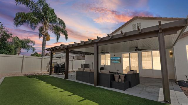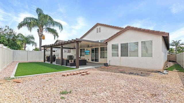 COMING SOON! Step into modern luxury with this meticulously updated, single-story retreat in the heart of Menifee. This 4-bedroom, 2-bathroom home boasts over 2,500 sq. ft. of light-filled living space , characterized by soaring vaulted ceilings and stylish, contemporary flooring throughout. The open-concept layout seamlessly connects the formal living area to a spacious family room , anchored by a stunning central fireplace. Culinary enthusiasts will love the kitchen’s sleek quartz counters, large island, and charming breakfast nook. The primary suite offers a peaceful getaway with a walk-in closet and direct backyard access. Both bathrooms feature high-end, modern finishes for a spa-like feel. Outside, the private yard is an entertainer’s dream, featuring a massive covered patio and a lush grass area. Bonus features include a leased solar system for energy efficiency and a spacious 3-car garage.