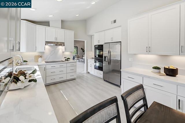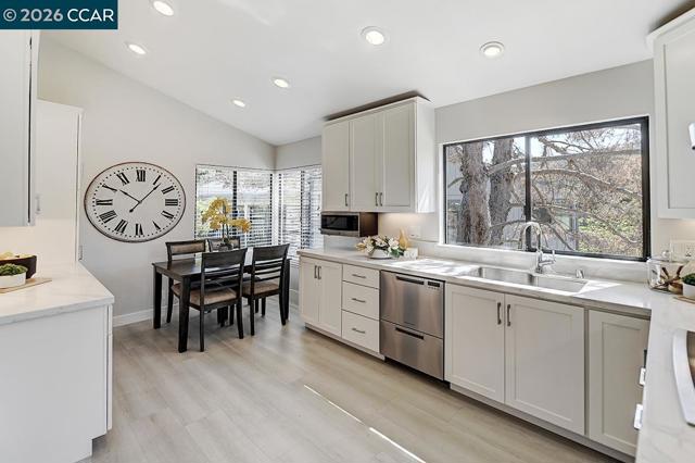 Discover elevated living in this desirable Cascade model, featuring a spacious great room–style living and dining area that opens to a wraparound deck with sweeping views of Rossmoor’s Dollar Ranch golf course, rolling hills, and serene valley. Vaulted ceilings in both the living area and eat-in kitchen create a light, airy ambiance, enhanced by recessed lighting and updated flooring throughout. The inviting living room features a beautiful stone fireplace with an electric insert. The updated kitchen offers quartz countertops, newer custom cabinetry, stainless steel appliances, and a double-drawer dishwasher with ample storage. Both bathrooms are stylishly remodeled with new vanities, custom stone, and designer tile. A separate laundry area includes full-size washer and dryer with added cabinetry. Complete with a detached garage and nearby parking, this home blends comfort, style, and convenience. Views: Ridge
