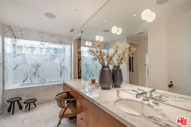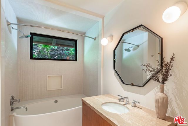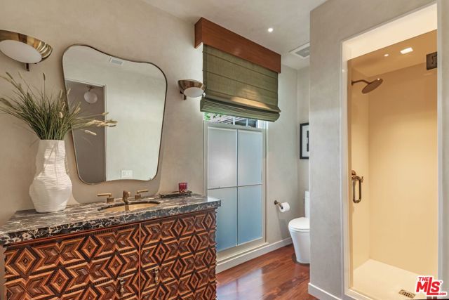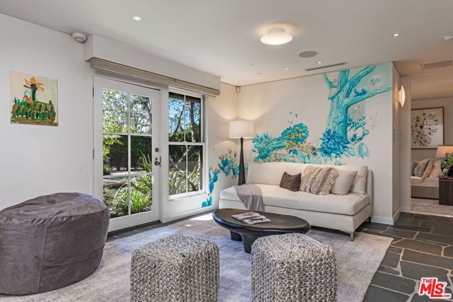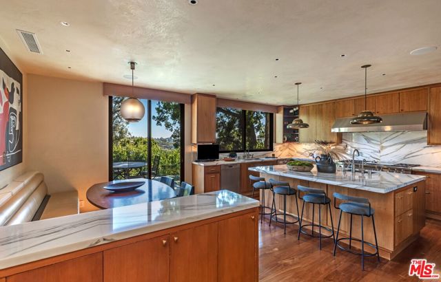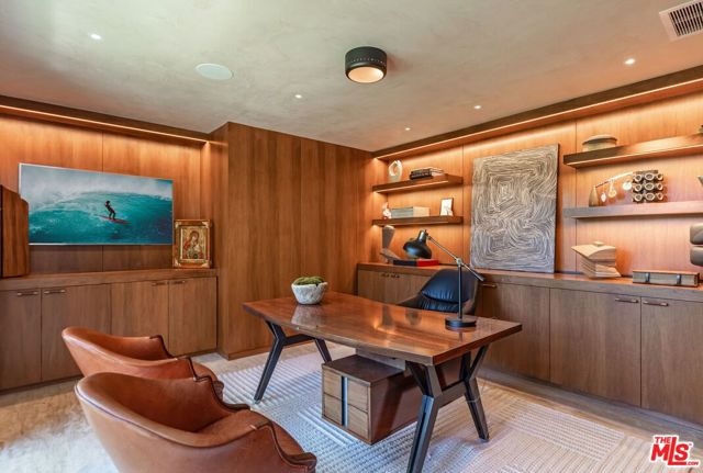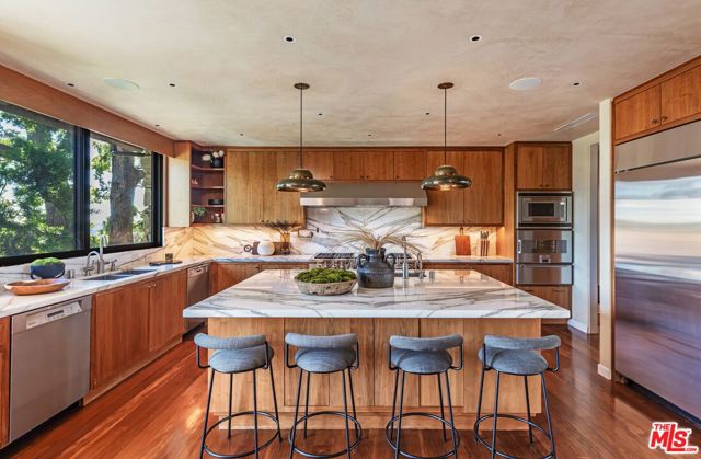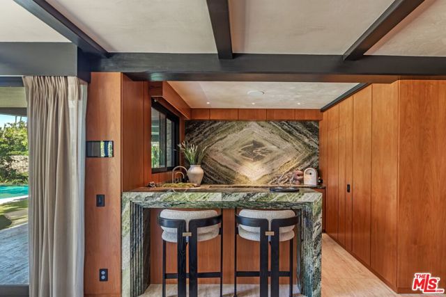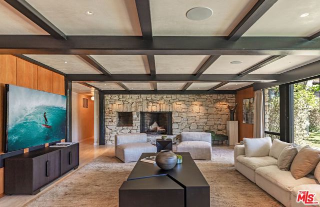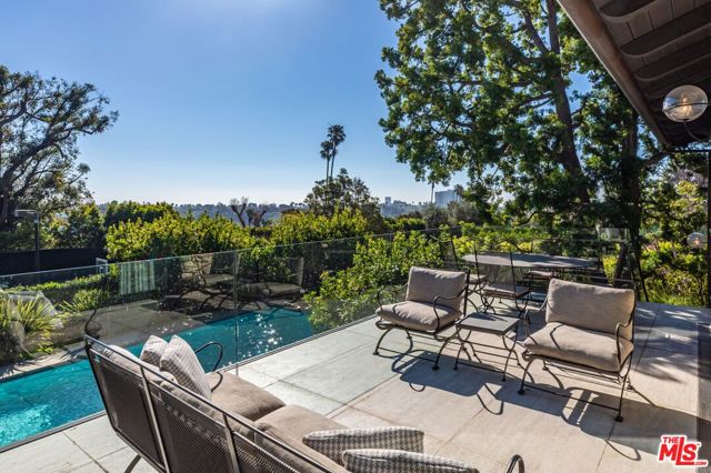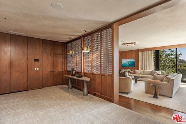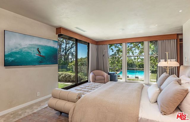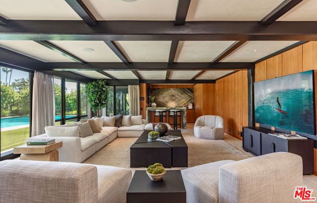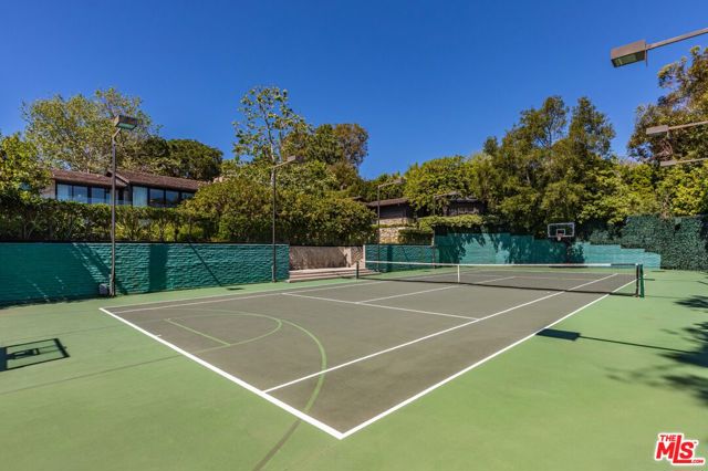 A rare Mid-Century by Arthur T. Gilman, AIA, set on one of the largest and most coveted lots in the Huntington Palisades. The home blends architectural pedigree with a polished California ease. A teak-lined foyer introduces expansive living spaces where walls of glass open to a balcony overlooking the pool, Santa Monica Canyon, and a championship north-south tennis court. Designed for both entertaining and quiet retreat, the residence offers a formal dining room, a gourmet kitchen with Caesarstone surfaces and warm walnut cabinetry, and a moody library with a wood burning fireplace. The primary suite is a true sanctuary with dual baths and closets, complemented by a dedicated children's wing with study, a guest suite, and separate nanny quarters with a private entrance. The lower level unfolds as a relaxed entertainment space with a bar, opening directly to the backyard for seamless indoor-outdoor living. A rare offering where architecture, scale, and setting converge to create something truly unforgettable.