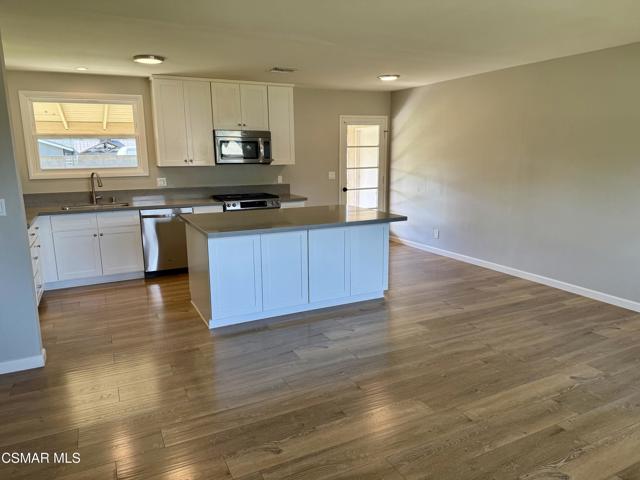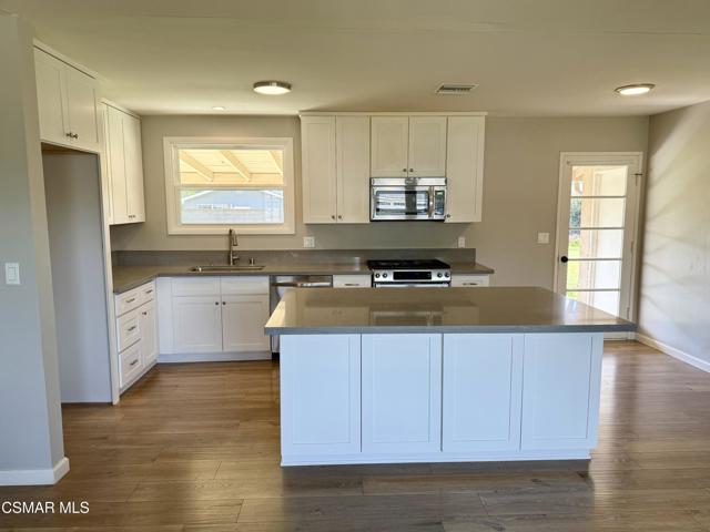 Beautifully remodeled single-story home with two car garage. This 3-bedroom, 2-bath residence offers a bright, open layout with wood-look flooring and newer paint throughout. The updated kitchen is a true centerpiece, featuring crisp white cabinetry, quartz slab countertops, stainless steel appliances--including a gas range, microwave, dishwasher, and sink--and a spacious center island with counter seating.Both bathrooms have been upgraded with newer vanities, sinks, toilets, fixtures, and shower/tub combinations finished with classic white subway tile. Additional features include central A/C, newer dual-pane windows, and recessed lighting for a clean, contemporary feel. The property also has a two-car garage with a dedicated laundry area and extra storage space. Step outside to a large, fenced backyard with a grassy area, and a solid covered patio--perfect for relaxing or entertaining year-round.