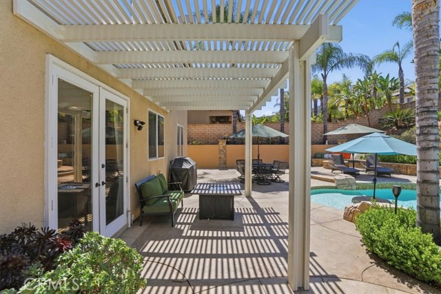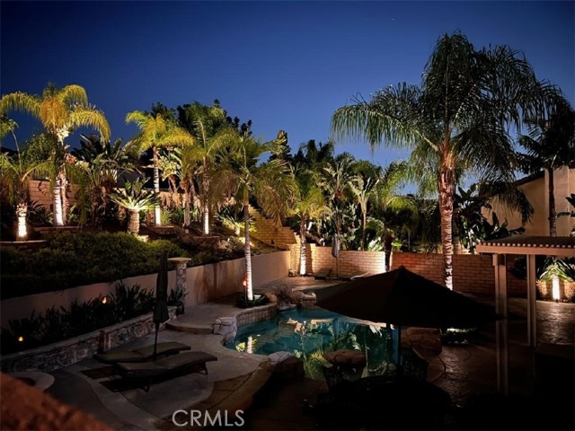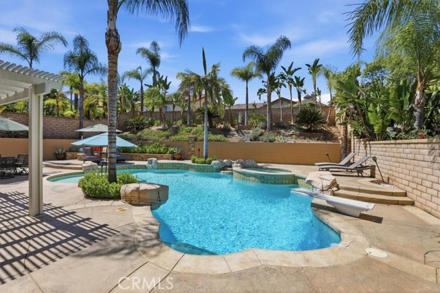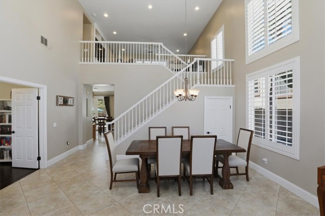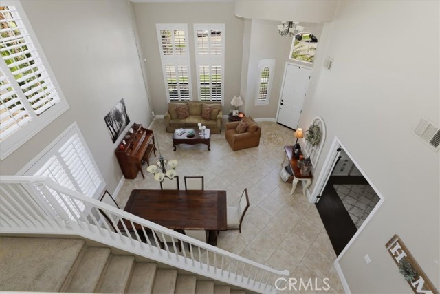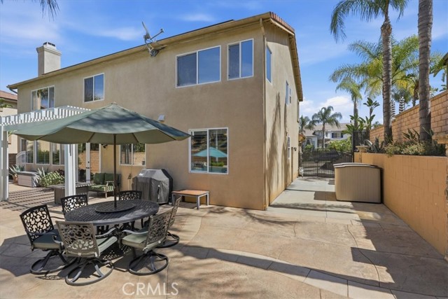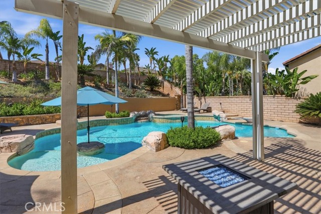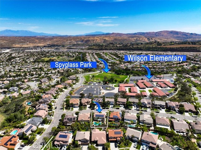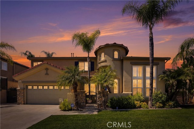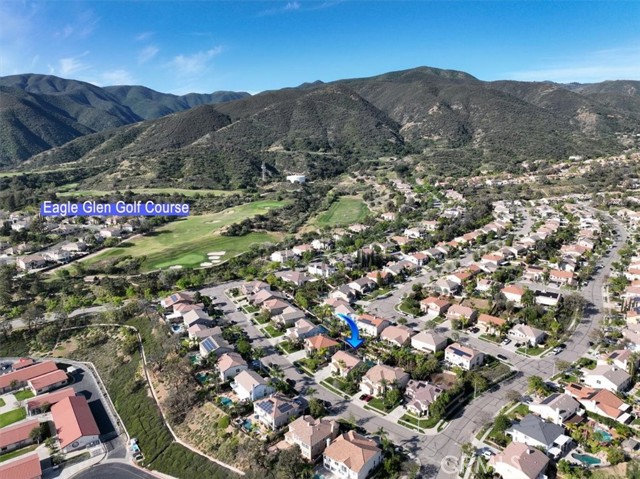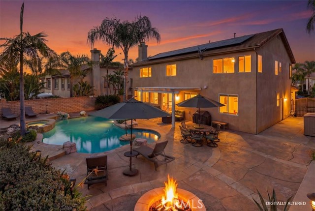 Paradise found in the highly sought-after Eagle Glen community! This exceptional home showcases one of the most desirable floor plans, offering approximately 2,885 square feet of well-designed living space with four bedrooms—including a convenient downstairs bedroom—three full bathrooms, a dedicated downstairs office, and an expansive upstairs loft/bonus room. Step inside to a grand entry featuring dramatic soaring ceilings, creating a light-filled and inviting atmosphere. The formal living and dining rooms set the stage for elegant entertaining, while the spacious family room features a built-in entertainment center and a stunning granite-surround fireplace with a custom mantle. The island kitchen is both functional and stylish, complete with granite countertops, stainless steel appliances, a built-in computer desk, and under-cabinet accent lighting. Upstairs, you’ll find three additional bedrooms, two bathrooms, and a generous loft/bonus room with custom built-ins—perfect for a media space large enough to accommodate an 85-inch TV. Throughout the home, enjoy thoughtful upgrades including plantation shutters, French doors, 7-inch baseboards, ceiling fans in every room, ample closet space, a custom storage bench, and Nest thermostats. Step outside to your own private resort-style backyard—truly a paradise! Enjoy a sparkling pool and spa with reef step and waterfall, stone seating pony walls surrounding a cozy fire pit, lush landscaping with Queen palms, sago, and Phoenix roebelenii palms, custom landscape lighting, stamped concrete, a lattice patio cover, and even a dog run. Additional highlights include privated gated courtyard, solar, low taxes and low HOA. Ideally located within walking distance to the Eagle Glen clubhouse—perfect for weekend breakfasts—and just a 5-minute drive to Dos Lagos for dining, entertainment, comedy shows, movies, and summer concerts. Beautifully upgraded and move-in ready—this is the home you’ve been waiting for!