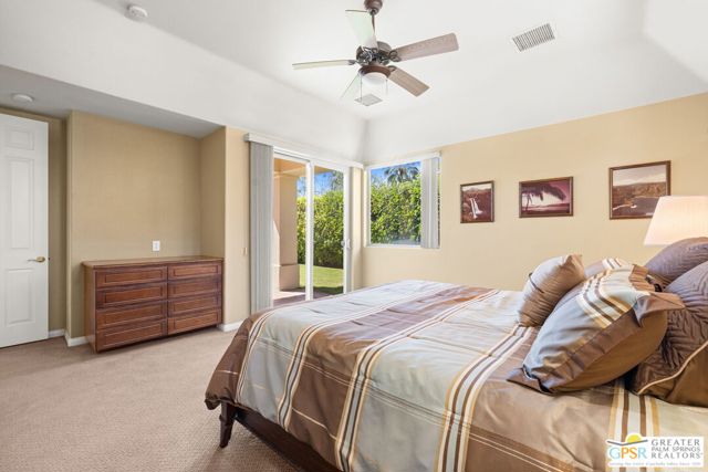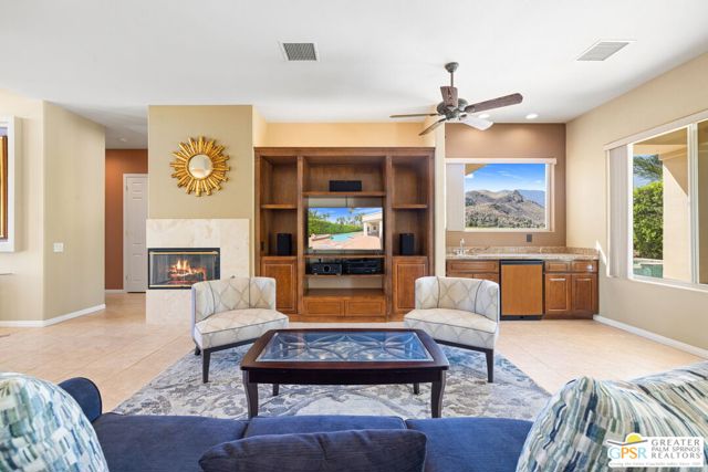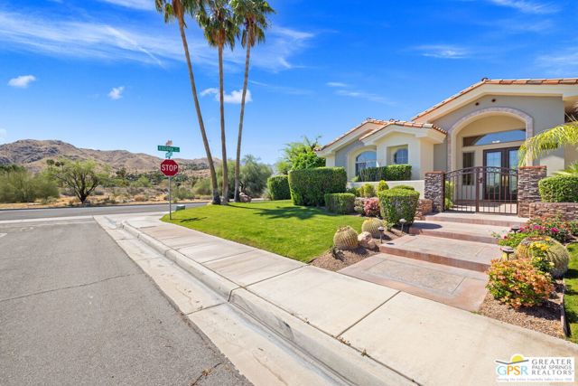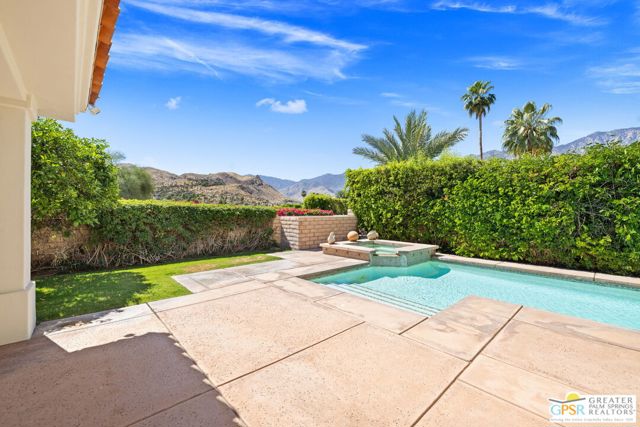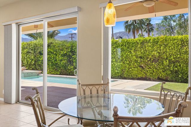 SUN, POOL, and MOUNTAIN VIEWS to the south and west set the tone for easy South Palm Springs living at this private backyard retreat. Tucked into a quieter pocket of the Los Compadres neighborhood, this residence offers a sense of privacy while remaining close to the best of town. Situated on Fee Land (you own it) and currently eligible for a Short Term Rental Permit. 3 bedrooms and 3 baths in 2,783 square feet. The backyard is a highlight with mature citrus, swaying palms, and a pool and spa with waterfall set against the mountain backdrop. No power lines to interrupt the view. Inside, main living areas are light and bright with tall ceilings and tile floors, opening to a long covered patio through a series of sliders. The living room features custom built ins, a fireplace, and wet bar with refrigerator and views. Formal dining includes a coved ceiling, motorized blinds, and French doors to a separate patio. The kitchen centers around a large island with counter seating, plus a walk in pantry, breakfast area, and desk alcove. Great separation of bedrooms. The ensuite primary features vaulted ceilings, clerestory windows, direct patio and pool access, a soaking tub, walk in shower, and generous closet space. Junior Ensuite 2 also opens to the pool with its own bath. Guest Bedroom 3 is currently used as an office and sits near a full bath featuring a clerestory window. Laundry room with utility sink is located off the kitchen. Direct access to a 3 car garage. All of this in a desirable South Palm Springs location close to dining, shopping, and everything that makes this part of the desert so easy to enjoy.