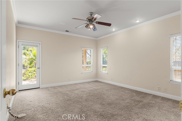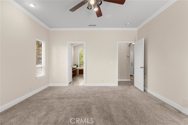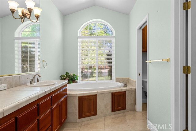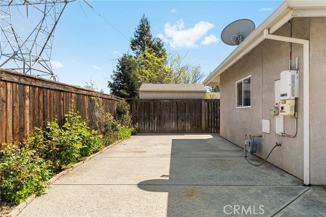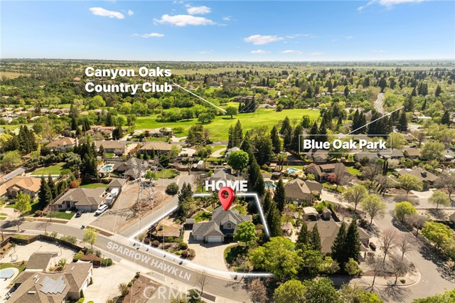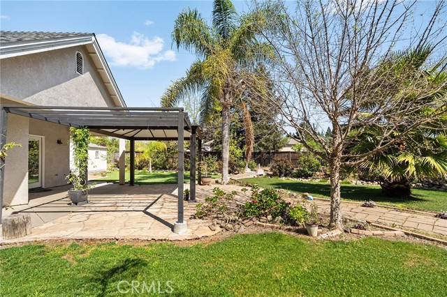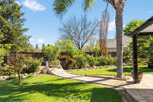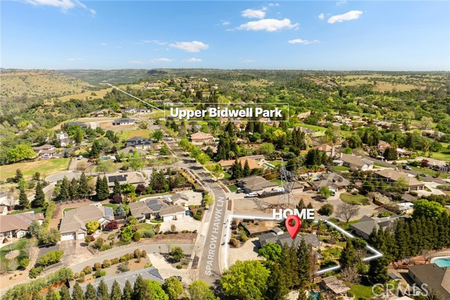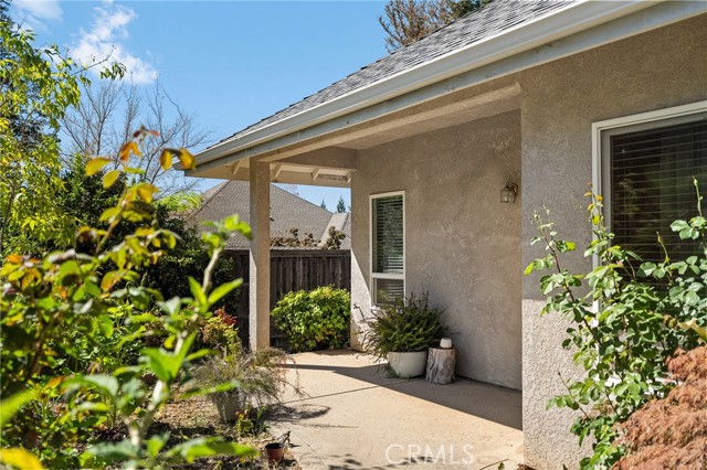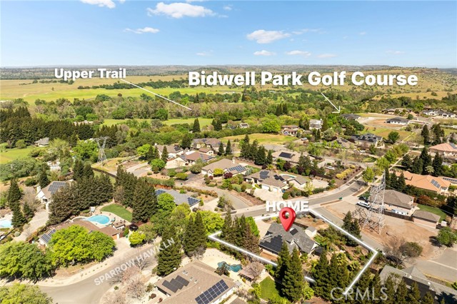 Set in a sought-after neighborhood near Upper Bidwell Park, this 4 bedroom, 2.5 bathroom home with owned solar offers a flexible layout and expansive outdoor space. This spacious 0.54-acre property offers a great outdoor setup with mature trees, roses, a garden area, and a large covered patio with extended flagstone walkways—plus plenty of room to expand or customize. At the front of the home, French doors open to a flexible den or bonus space that works well as a home office, second living area, or potential 5th bedroom. Inside, the open layout is complemented by 10-foot ceilings, crown molding, and oversized baseboards, creating a comfortable and cohesive feel throughout. The main living and dining areas are anchored by a two-sided gas fireplace and offer nice views of the backyard. The kitchen is spacious and functional, featuring granite countertops, a tile backsplash, double ovens, an extra-large pantry, and a peninsula with bar seating that connects to the dining area—ideal for everyday living and entertaining. The downstairs primary suite offers privacy and space, complete with a large walk-in closet and an en-suite bathroom with dual sinks, a jetted tub, separate shower, and privacy door. Also downstairs is a half bath and an indoor laundry room with a sink, counter space, and plenty of storage. Upstairs, you’ll find three generously sized bedrooms and a full bathroom. Additional features include whole-house sound wiring, a 3-zone HVAC system, a whole house fan, and owned solar for added efficiency. The backyard is expansive and thoughtfully laid out with mature landscaping, garden areas, a storage shed, and plenty of usable space. The property also includes an oversized 3-car finished garage and RV or boat parking with room for expansion. Conveniently located near schools, shopping, parks, and golf courses, this home offers space, functionality, and a great location.