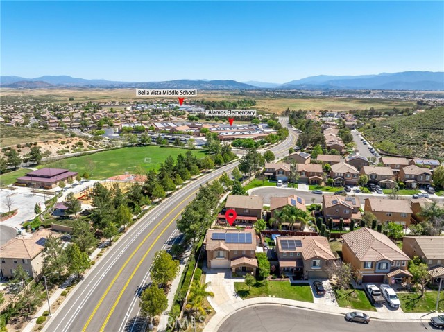 Located just 10 minutes from the Temecula Wineries and walking distance to Top-Rate Schools, this Murrieta home has it all! Welcome to 38332 Chestnut Circle, a beautifully cared for 3-Bedroom, 2.5-Bathroom home in the desirable community of Rancho Bella Vista. This home sits less than a block away from Alamos Elementary School and within walking distance to Bella Vista Middle School, Sports Park, Playground, and Recreation Center. As you step inside, you will notice the functional and well-designed floor plan. The main level showcases stylish mosaic tile flooring and a spacious living area centered around a cozy fireplace with a classic mantel, creating the perfect space for both relaxing and entertaining. The kitchen is upgraded with custom lighting, stainless steel appliances, and ample cabinetry, offering style and functionality. Upstairs, you will find a generously sized loft providing flexible living space ideal for a home office, game room, media room, or play area. The oversized primary suite is your peaceful retreat, complete with a large walk-in closet and walk-in shower. Additional bedrooms are well-proportioned and versatile for family, guests, or workspace needs. The backyard is beautifully maintained with mature trees, vibrant flowers, and lush greenery, creating a private and serene outdoor setting. Enjoy year-round outdoor living under the Alumawood patio cover, and unwind in the spa after a long day. The home is equipped with an energy-efficient solar system with approximately 8 years remaining on the solar lease, offering significant savings on utility costs. Don’t miss this opportunity to own a turn-key home in one of Murrieta’s most sought-after neighborhoods.