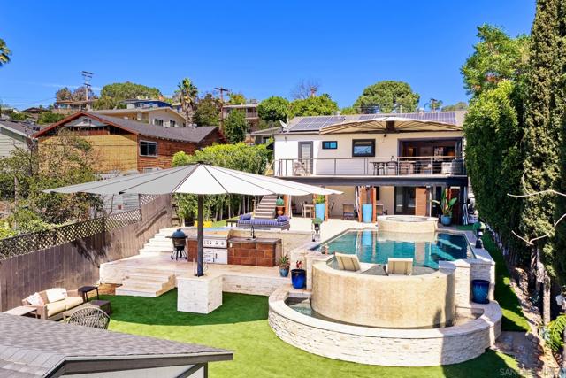 It's one thing to be in a prime Downtown La Mesa location with an easy walk to restaurants, pubs, cafes, bistros & shopping & to have panoramic evening light views & vanishing wall from the living room to oversized entertainment deck & an ADU with full kitchen, but to also feature a swimming pool with swim-up bar, spa & lounge worthy of an Insane Pools off the Deep End episode?! Well, welcome to this one-of-a-kind 1940s Craftsman in popular Historic La Mesa Village. Beautifully remodeled & turnkey, too! >>> UPGRADES: Brand new 20x20 detached garage completed in 2026, custom salt water and mineral swimming pool with remote control and LED lights, dual pane windows installed 2020, smooth synthetic stucco 2020, paid 13,800 kWh solar system, new electrical panel 200 amp, rare seashell awnings designed and manufactured in Australia (PVC reinforced canvas material rotates with the wind, closes with rare earth magnets), brand new 10-year warranty carpeting with top-of-the-line pad, interior paint less than one year old, brand new range stove, newer refrigerator, dual laundry (upstairs/downstairs), black-and-white Parisian tile floor, finished basement, completely waterproofed deck with brand new textured floor for no water leaks when it rains, new cable railing, pet-friendly artificial turf installed three months ago in the backyard. <<<