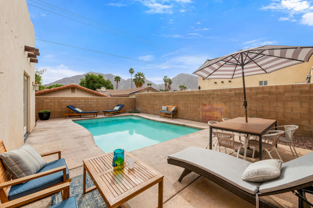 Beautiful Views in this charming Santa Fe-style home offering 3 bedrooms, 2 baths, and 1,709 square feet of open-concept living. Lovingly cared for and thoughtfully enjoyed by its current owners, this special property is now ready for its next chapter as the sellers relocate to Orange County for work and school.From the moment you arrive, you'll feel the love and care that has been poured into this home. Inside, the open floor plan creates a comfortable and inviting space for everyday living and entertaining. Outside, you'll enjoy fabulous views of the stunning Santa Rosa Mountains, breathtaking sunsets, and your own private pool for relaxing under the desert sky. A cozy fireplace adds the perfect touch for cool winter evenings, while the attached two-car garage offers convenience and storage.Location is everything, and this home truly delivers. You'll be close to hiking trails, pickleball at Fritz Burns Park, shopping, restaurants, markets, Old Town La Quinta, local mini festivals, SilverRock Golf Resort, and PGA WEST. Best of all, there are no HOA fees, making this an affordable opportunity to enjoy the desert lifestyle in one of La Quinta's most beloved neighborhoods.Priced right and filled with character, comfort, and charm, this is a home you will not want to miss. Come experience all that makes this property so special.