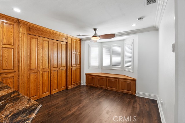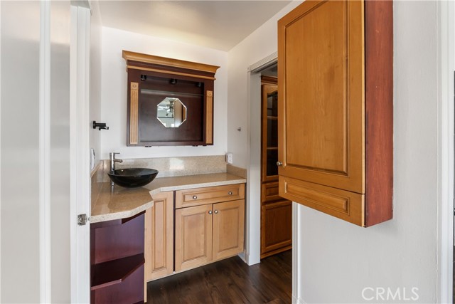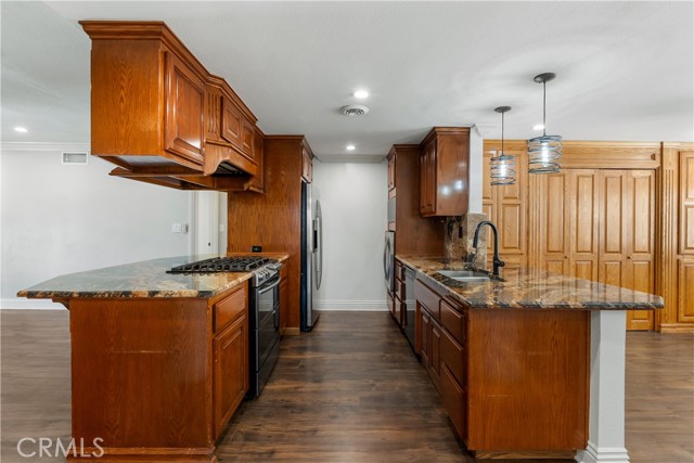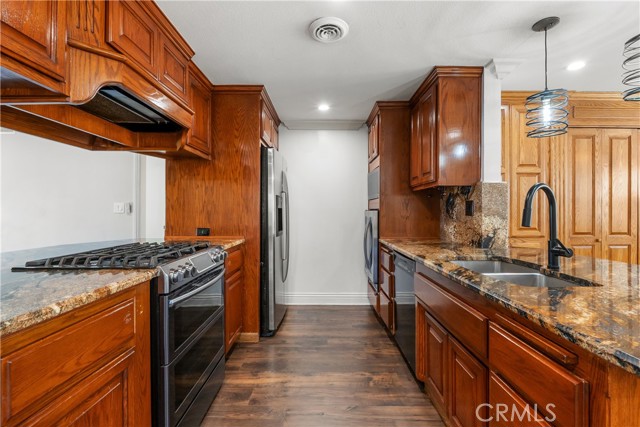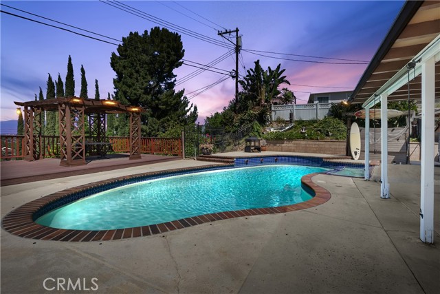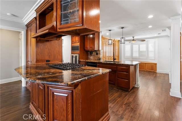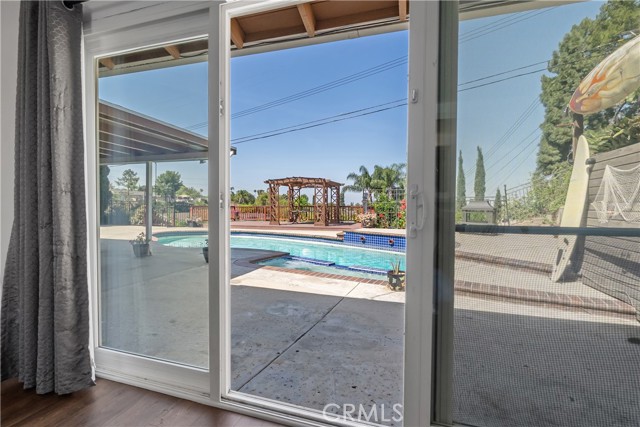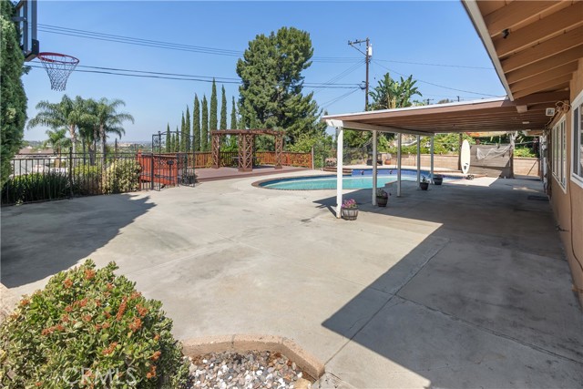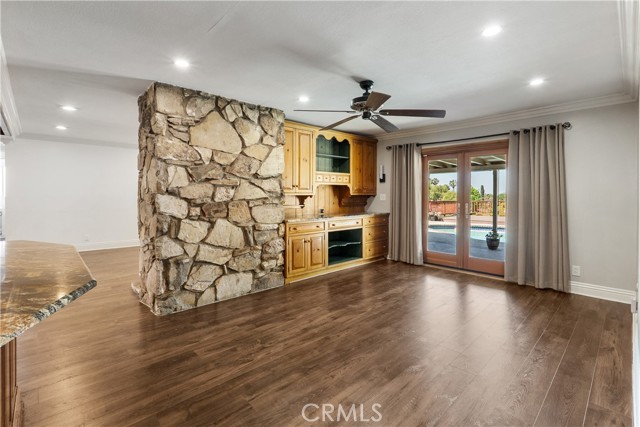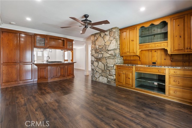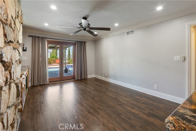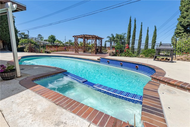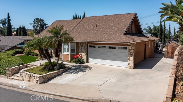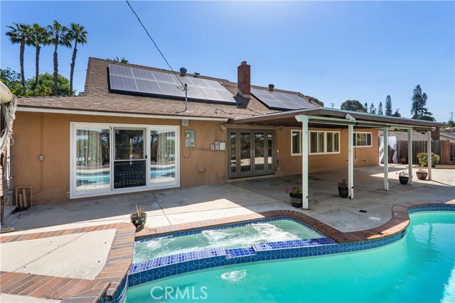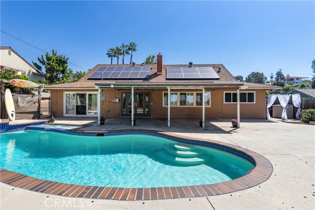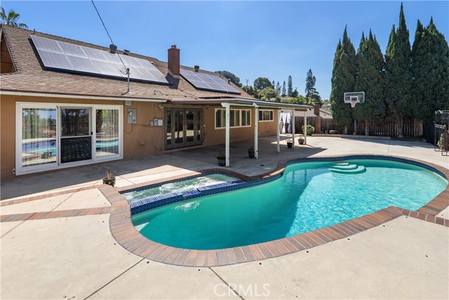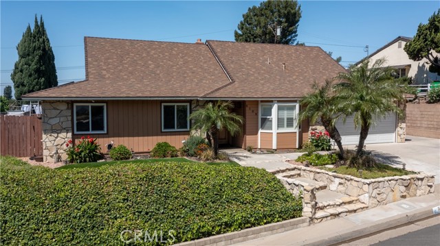 A rare opportunity to own a turnkey, design-forward home in a highly sought-after community! This stunning single-story 4 bed, 2 bath home has been completely remodeled with exquisite detail. The open-concept layout seamlessly blends luxury and functionality. Exceptional curb appeal sets the tone with a striking flagstone façade, complementary custom built-in planters, and artificial turf. Inside, warm walnut-toned laminate flooring, recessed lighting, custom trim, and elevated finishes flow throughout. The living room is anchored by a natural gas fireplace and is pre-wired for media—perfect for both relaxing and entertaining. The dining area features a built-in bar with seating and dual French doors with sidelights that overlook the resort-style backyard, creating an ideal indoor-outdoor connection. The fully upgraded kitchen is a true showpiece, complete with custom cabinetry, granite countertops in a desert canyon sunset-inspired palette, breakfast bar, breakfast nook, sleek stainless steel appliances including a built-in microwave, freestanding range, wine fridge, and designer pendant lighting. The floor plan is ideal, with common areas at the heart of the home and sleeping quarters on each wing. Three generously sized bedrooms offer closet built-ins and dual-pane windows that fill each space with natural light. A shared bath features a custom vanity with copper basin sinks, oil-rubbed bronze waterfall faucets, smart mirrors, and a tub/shower combo with complementary hardware and glass doors. The primary suite is a tranquil retreat with sliding door access to the backyard. The ensuite includes a black marbled tile shower with custom niches and glass doors, a separate vanity area with a raised bowl sink, two-tone cabinetry, and a walk-in closet. The resort-style backyard offers a sparkling pool and spa, covered patio, expansive cantilevered deck, basketball court, curated landscaping, and ambient lighting—perfect for entertaining or unwinding under the California sun and star-filled skies. The lower level features producing fruit trees, including citrus varieties, and a versatile greenbelt space. Additional highlights include an attached garage with direct access, built-in cabinetry, workbench, overhead storage, and convenient RV parking. Ideally located near world-renowned attractions such as Angel Stadium, Honda Center, Disneyland; plus shopping, dining, and freeway access, this home offers the best of Southern California living.