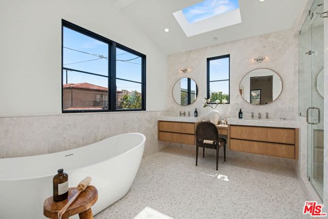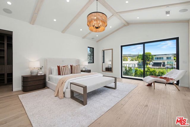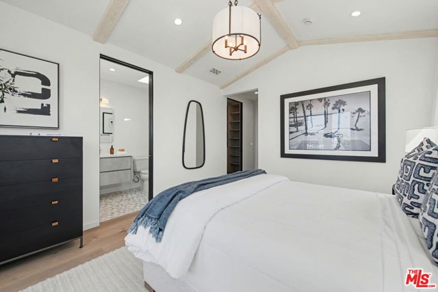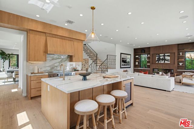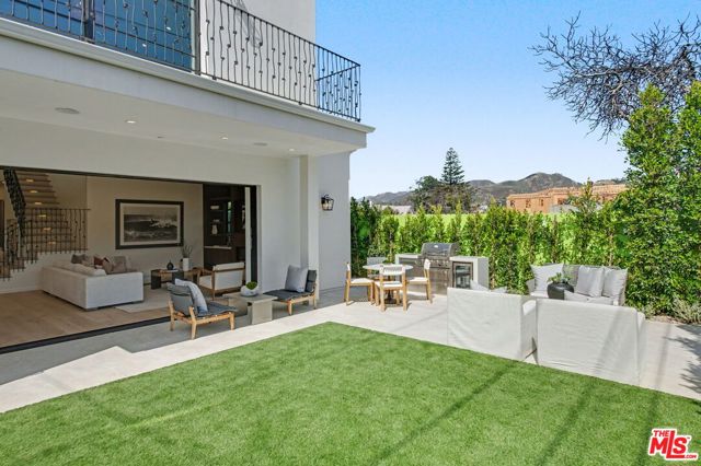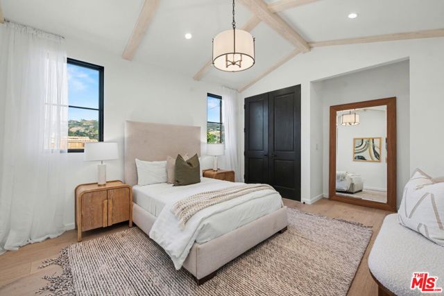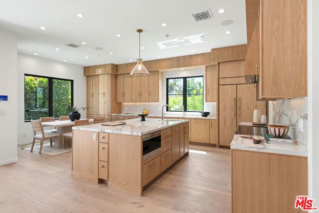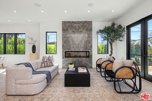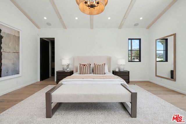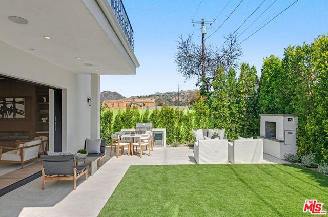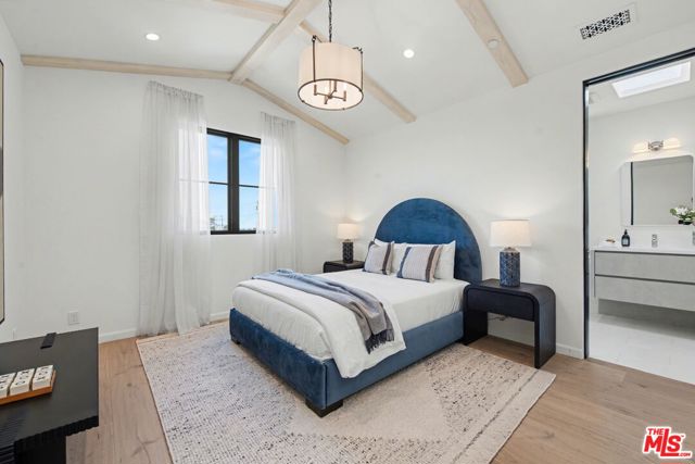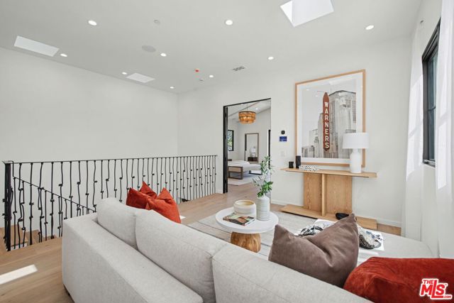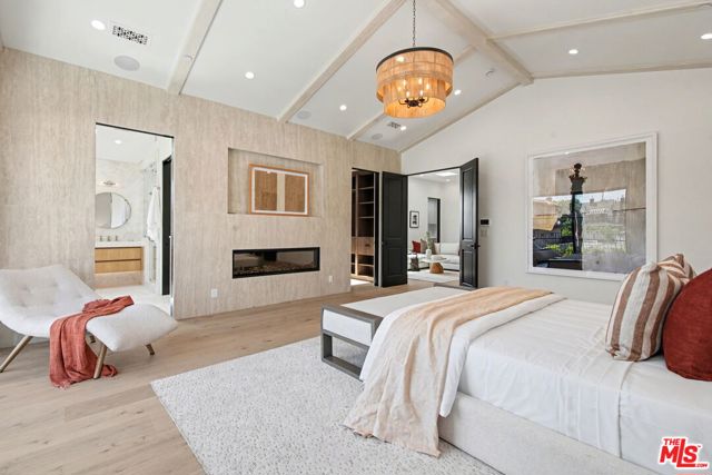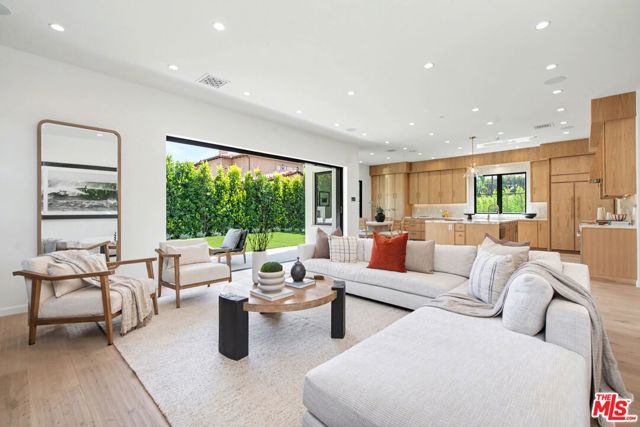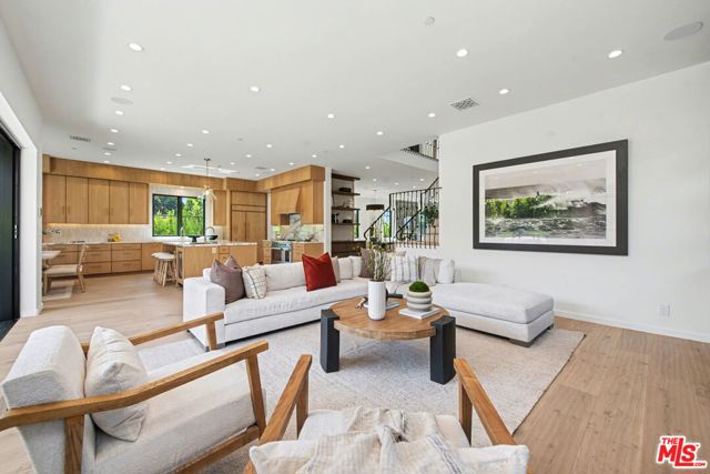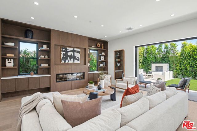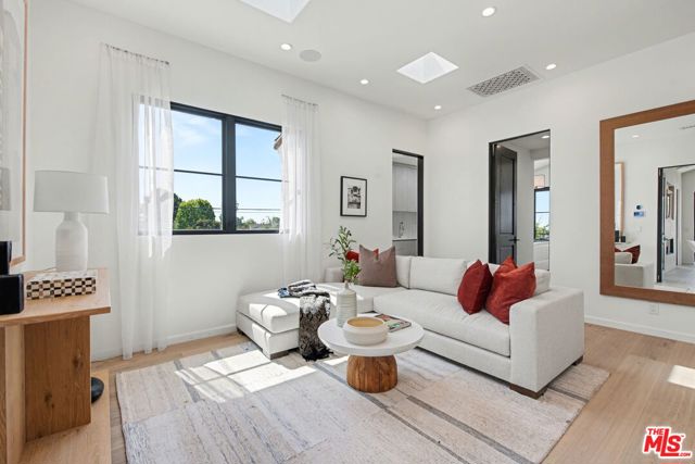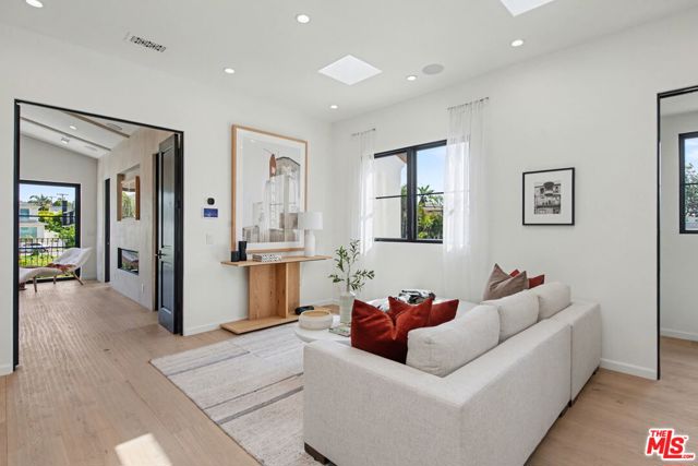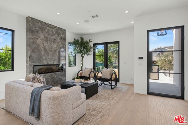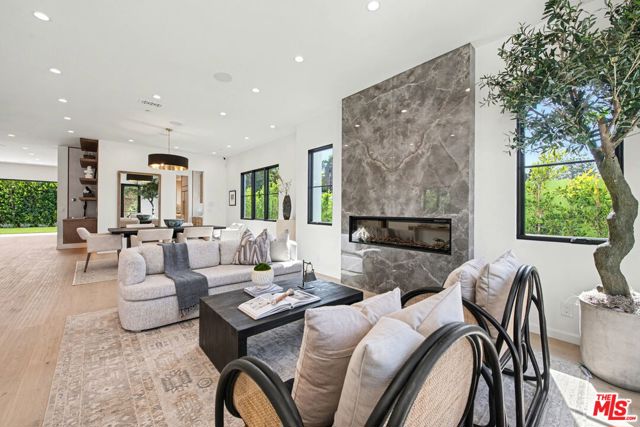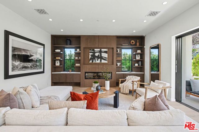 Welcome to this newly constructed Modern Spanish residence in the coveted El Medio Bluffs in Pacific Palisades. Offering five bedrooms and five bathrooms, this home blends contemporary sophistication with Spanish-inspired architectural details for an exceptional indoor-outdoor living experience. The entry opens to a bright, expansive living area thoughtfully designed for modern lifestyles. The chef's kitchen combines function and style with premium stainless steel appliances, an oversized center island, and sleek custom cabinetry. The kitchen flows seamlessly into a spacious family room, creating a true open-concept layout well-suited for entertaining and daily living. Walls of glass and disappearing sliding doors provide abundant natural light and create effortless access to a landscaped yard and outdoor patio. A patio fireplace enhances the space, offering year-round usability and an ideal setting for gatherings. The primary suite is a private retreat featuring vaulted wood-beam ceilings and a fireplace. The spa-inspired ensuite includes high-end finishes, a soaking tub, a generous walk-in shower, and a private balcony for quiet enjoyment. Four additional bedrooms provide ample flexibility, and the remaining bathrooms are finished with modern design elements and quality materials throughout.