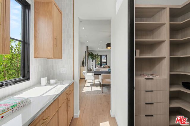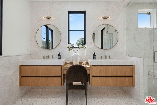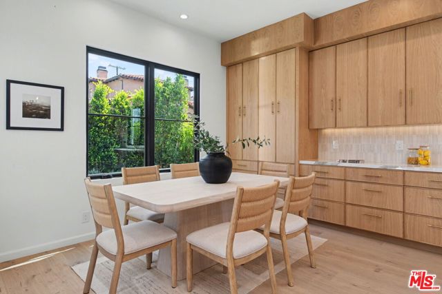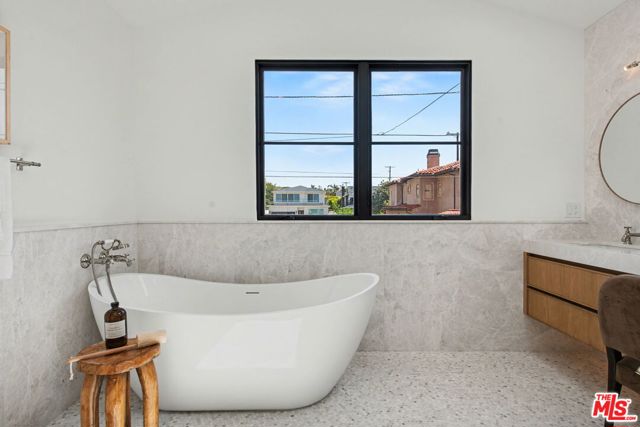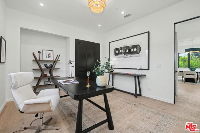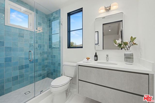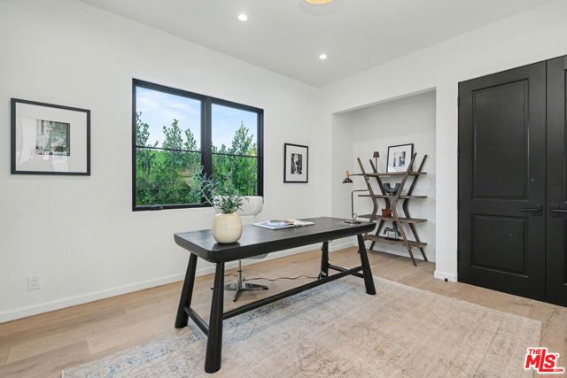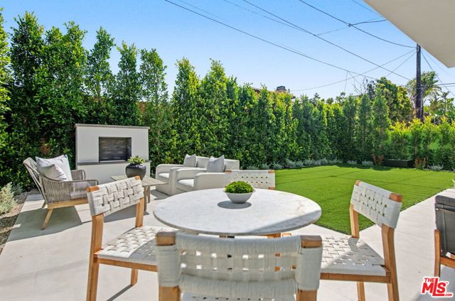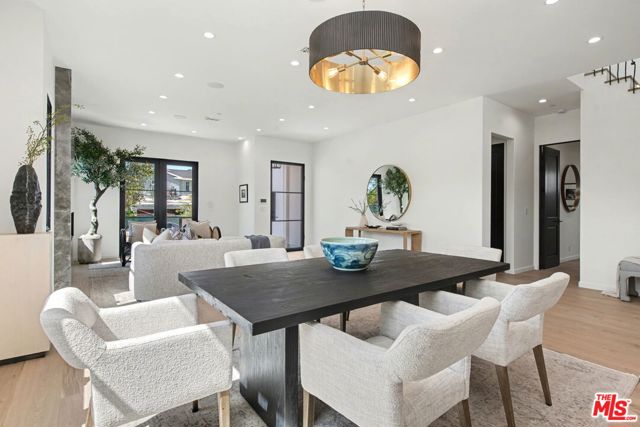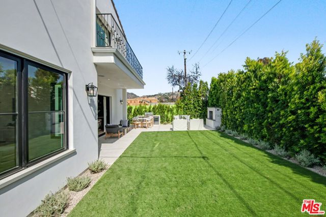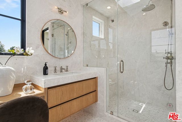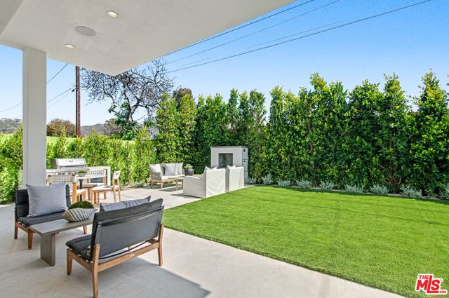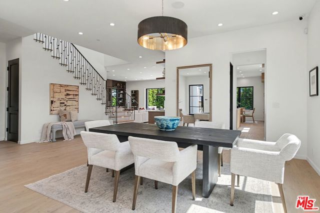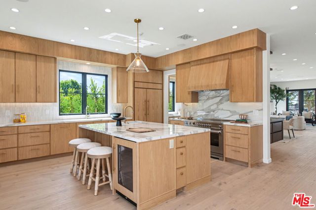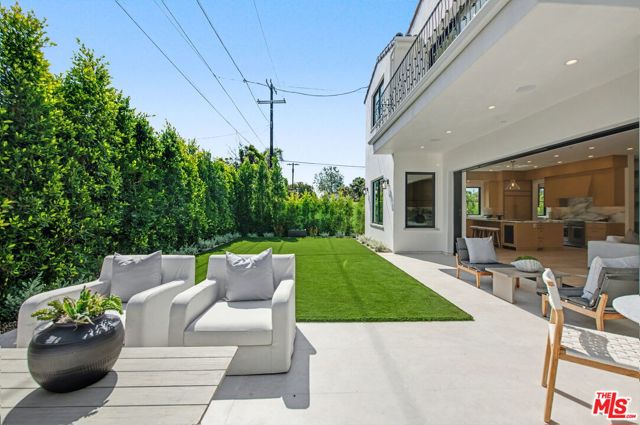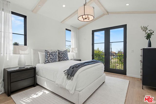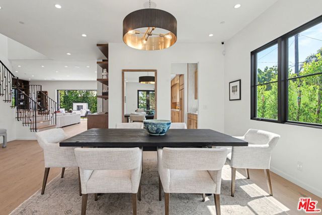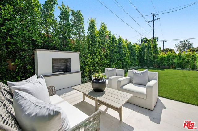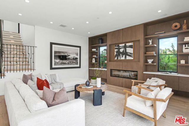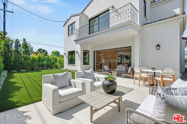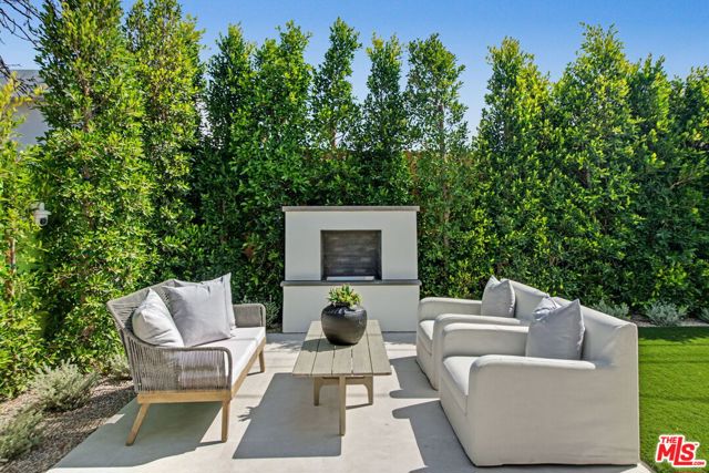 Welcome to this newly constructed Modern Spanish residence in the coveted El Medio Bluffs in Pacific Palisades. Offering five bedrooms and five bathrooms, this home blends contemporary sophistication with Spanish-inspired architectural details for an exceptional indoor-outdoor living experience. The entry opens to a bright, expansive living area thoughtfully designed for modern lifestyles. The chef's kitchen combines function and style with premium stainless steel appliances, an oversized center island, and sleek custom cabinetry. The kitchen flows seamlessly into a spacious family room, creating a true open-concept layout well-suited for entertaining and daily living. Walls of glass and disappearing sliding doors provide abundant natural light and create effortless access to a landscaped yard and outdoor patio. A patio fireplace enhances the space, offering year-round usability and an ideal setting for gatherings. The primary suite is a private retreat featuring vaulted wood-beam ceilings and a fireplace. The spa-inspired ensuite includes high-end finishes, a soaking tub, a generous walk-in shower, and a private balcony for quiet enjoyment. Four additional bedrooms provide ample flexibility, and the remaining bathrooms are finished with modern design elements and quality materials throughout.
