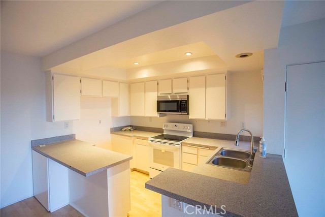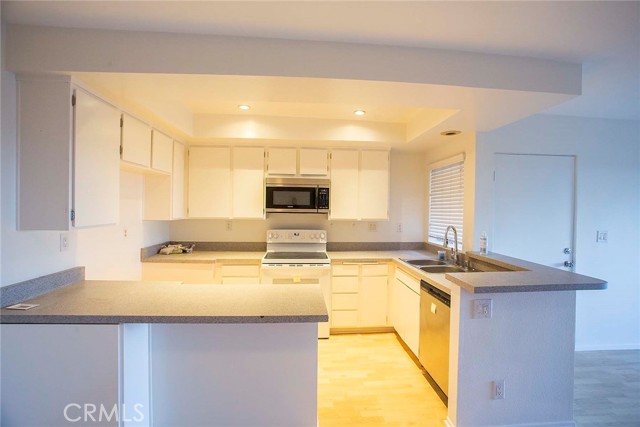 Stylish top-floor two-bedroom condo featuring partial ocean views and modern upgrades throughout. The inviting living space showcases laminated maple flooring, smooth ceilings, contemporary lighting, and sleek nickel hardware, creating a bright and refined atmosphere. Both bedrooms are generously sized with ample closet space. The unit includes convenient in-home laundry hook-ups, with additional community laundry facilities available. Enjoy the ease of two side-by-side covered parking spaces, plus a private storage shed for extra belongings. The well-maintained complex offers beautifully landscaped grounds and a community pool for residents to enjoy. Located within an award-winning school district and just minutes from schools, parks, and shopping centers, this home combines comfort, style, and convenience.