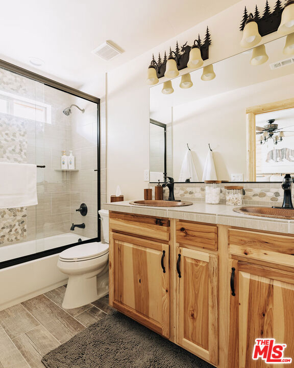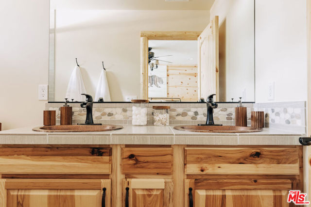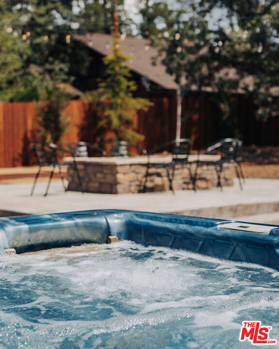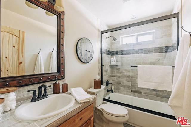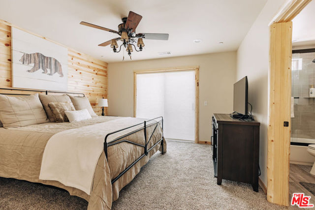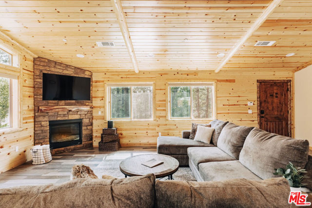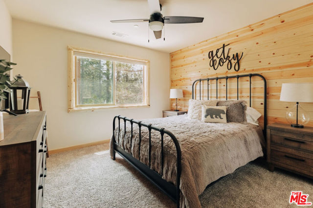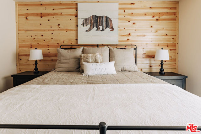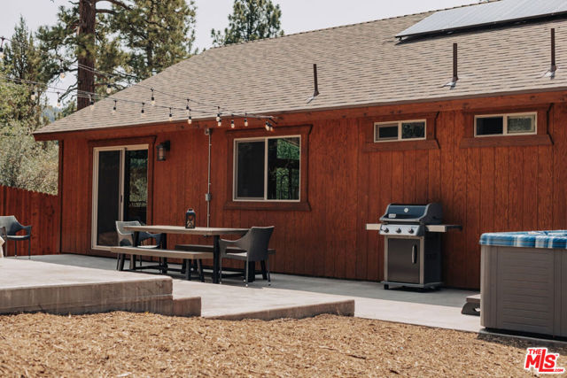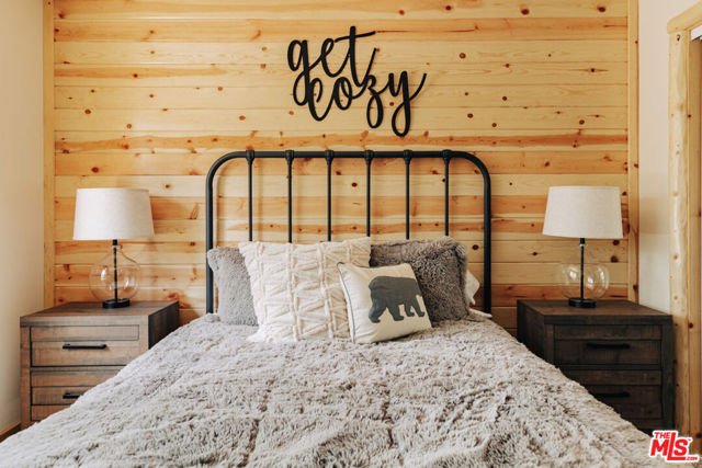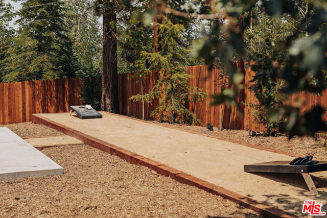 This home is relatively new and comes fully furnished with stainless steel appliances, bedding, kitchen supplies, etc. The great room has a large sectional that has a queen size pull out sofa bed. There is a gas burning fireplace, a 60 inch smart tv, and a large wifi blue tooth speaker that can be used to listen to your favorite playlist. The cabin comes with a variety of board games and card games. The beautiful kitchen comes equipped with a refrigerator with filtered water, dishwasher, microwave, Keurig coffee maker, toaster, blender, and crockpot. It provides serving for twelve and professional grade Viking pots and pans for all the chefs that visit our home. The master bedroom offers a king size bed, 40 inch smart tv, walk in closet, connecting bathroom, and slider that accesses the backyard. One of the guest rooms has a queen size bed and the other guest room has a full bunkbed with a twin on top and a twin trundle underneath. Both of these bedrooms also have 40 inch smart tv's. The great room and all the bedrooms have ceiling fans. Both bathrooms have a tub/shower combo and come supplied with shampoo, conditioner, body wash, plenty of towels, and there is a blow dryer in each. In the hallway, there is a full washer and dryer that can be used throughout your stay. Our recently completed backyard has an outdoor picnic style dining table, hot tub that seats seven, gas BBQ, large fire pit, and a gaming court to play corn hole and bocce ball (both of which are provided). The cabin is centrally located to many Big Bear activities & attractions!