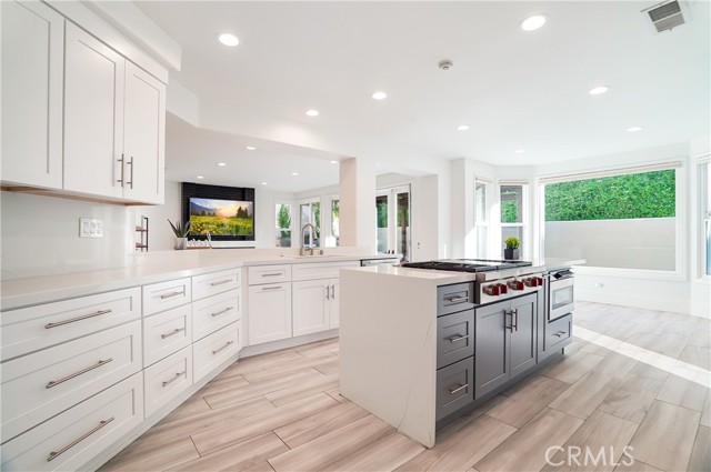 This guard gated Calabasas Hills home is absolutely exquisite! Featuring sleek gray floors, an open layout, fresh paint, recess lighting, and chef's kitchen boasting quartz countertops, high-grade appliances and a fabulous center island, it's clear that every detail has been carefully thought out! Boasting a combo formal living room- dining room and bar area, this home is perfect for hosting gatherings and accommodating guests. The soaring high ceilings and impressive finishes throughout add to the sense of luxury and grandeur. Also find a main level bedroom, office, designated laundry room and a fantastic 3 car garage! Upstairs, the lavish primary suite, complete with two walk-in closets and an ensuite fit for royalty, offers a serene retreat within the home. Additionally, the second floor features a bonus room and remaining secondary bedrooms. Plus, gorgeous renovated bathrooms! The built-in BBQ and multiple lounge areas make outdoor entertaining a breeze. The lush landscaping adds a touch of natural beauty to the property, creating a serene atmosphere. This beauty is in close proximity to schools, parks, and community swimming pools. This Calabasas Hills gem offers the perfect blend of elegance and a family friendly vibe.