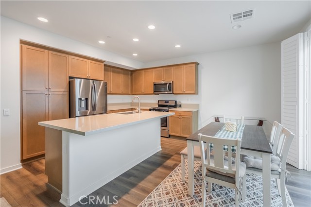 Experience luxury resort-style living in the highly sought-after community of The Resort in Rancho Cucamonga. This modern two-story home blends comfort, functionality, and elegant design, offering 4 bedrooms, 3 bathrooms, and 1,528 sq ft of thoughtfully designed living space. Enter through the arched doorway into a bright, airy interior featuring vinyl wood flooring and recessed lighting throughout. The open-concept layout seamlessly connects the spacious family room to the beautifully upgraded kitchen—complete with quartz countertops, rich brown cabinetry, a large quartz island with bar seating, and stainless steel appliances. From the kitchen, enjoy effortless flow into the living room and enclosed backyard patio—perfect for indoor-outdoor entertaining. The first floor includes a well-sized bedroom with plush carpeting and a full bathroom, ideal for guests or a home office. Upstairs, you'll find three additional bedrooms and two bathrooms, including the luxurious primary suite featuring dual vanities, a walk-in shower, and a spacious walk-in closet. Each bedroom offers comfort and style, creating peaceful retreats for family and visitors alike. Step outside to your private backyard oasis, or enjoy the exceptional amenities of The Resort—including a sparkling pool and spa, outdoor kitchen and dining area, and beautifully landscaped common areas. Conveniently located just minutes from top-rated schools, shopping, dining, and recreational opportunities, this exceptional home truly offers the best of comfort and convenience. Don’t miss your chance to make it yours!