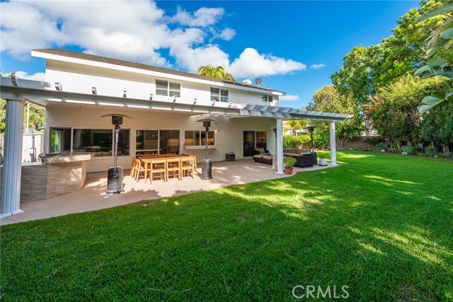 Step into a home where timeless architecture meets elevated contemporary living. This beautifully upgraded two-story residence offers 4 bedrooms, 3 bathrooms, and 2,376 square feet blending mid-century modern character with top-to-bottom renovations. From the moment you arrive, the crisp white board-and-batten façade, lush tropical landscaping, and paver driveway set the tone. Natural light pours through oversized windows, highlighting warm wide-plank hardwood floors throughout. The formal living and dining rooms invite effortless entertaining, anchored by a stunning fireplace with recessed lighting and crown molding. The chef's kitchen features sleek flat-front white cabinetry, Quartz countertops, stainless steel appliances, and a garden window overlooking the covered patio. A secondary family room with a custom built-in entertainment center offers the perfect relaxed gathering space. The primary suite features its own fireplace, ceiling fan, plantation shutters, and a generous walk-in closet. The spa-inspired en-suite bath includes floor-to-ceiling porcelain tile, a freestanding soaking tub, frameless glass shower, dual-sink floating vanity, and clerestory windows. Three additional bedrooms and a full upstairs bathroom provide flexibility for family or guests. Set on an 8,100 sq ft lot, the backyard is made for California living — a lush lawn, covered pergola, outdoor dining, built-in BBQ, and multiple seating zones surrounded by mature hedging. The two-car garage includes built-in storage cabinets. Community amenities include a pool, heated spa, basketball and tennis courts. Minutes from UCI, Irvine Spectrum, South Coast Plaza, Fashion Island, John Wayne Airport, and Newport Beach. Don't miss this rare opportunity to lease one of the area's most distinctive move-in ready homes.