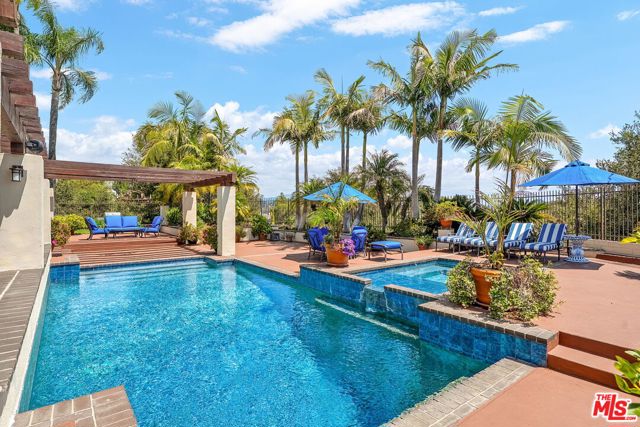 Truly spectacular & desirable 3-bedroom townhouse located in Bel Air Ridge Community with 180-degree views of the City & Mountains with its own private pool & spa on a promontory at the end of a quiet cul-de-sac that is walled for privacy. The spacious primary suite with balcony and fabulous views has a remodeled bathroom and custom walk-in closet. The 3rd bedroom is located on the main level which makes a great quest suite or office. High ceilings, open floor plan, and a remodeled chef's kitchen with breakfast area. The entry foyer flows into a large formal dining room with adjacent den with fireplace, and living room with fireplace. French doors thru out that open to mature Palm trees and room to throw a football. Enjoy morning walks in the neighborhood near the Glen Center. Resort style living with exclusive use of gym, 2 pools, spa, 6 tennis courts, Pickle Ball courts, club house, 24/7 patrol security, and private park. Located in the highly rated Roscomare Road school district. This home has it all!